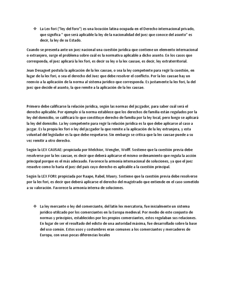 que ser aplicable la ley de la nacionalidad del juez que conoce del asunto" es decir, la ley de su Estado. Cuando se presenta ante un juez nacional una cuestin jurdica que contiene un elemento internacional o extranjero, surge el problema sobre cul es la normativa aplicable a dicho asunto. En los casos que corresponda, el juez aplicar la lex fori, es decir su ley o la lex causae, es decir, ley extraterritorial. Jean Desagnet postula la aplicacin de la lex causae, o sea la ley competente para regir la cuestin, en lugar de la lex fori, o sea el derecho del Juez que debe resolver el conflicto. Por la lex causae hay un reenvo a la aplicacin de la norma al sistema jurdico que corresponda. Es justamente la lex fori, la del juez que decide el asunto, la que remite a la aplicacin de la lex causae.