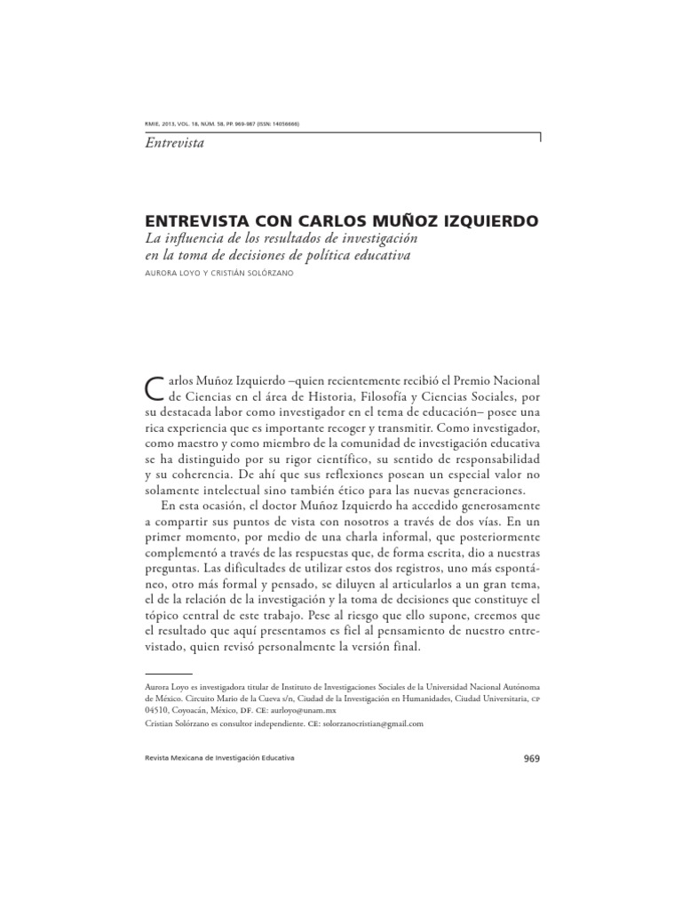 arlos Muoz Izquierdo quien recientemente recibi el Premio Nacional de Ciencias en el rea de Historia, Filosofa y Ciencias Sociales, por su destacada labor como investigador en el tema de educacin posee una rica experiencia que es importante recoger y transmitir. Como investigador, como maestro y como miembro de la comunidad de investigacin educativa se ha distinguido por su rigor cientfico, su sentido de responsabilidad y su coherencia. De ah que sus reflexiones posean un especial valor no solamente intelectual sino tambin tico para las nuevas generaciones. En esta ocasin, el doctor Muoz Izquierdo ha accedido generosamente a compartir sus puntos de vista con nosotros a travs de dos vas. En un primer momento, por medio de una charla informal, que posteriormente complement a travs de las respuestas que, de forma escrita, dio a nuestras preguntas. Las dificultades de utilizar estos dos registros, uno ms espontneo, otro ms formal y pensado, se diluyen al articularlos a un gran tema, el de la relacin de la investigacin y la toma de decisiones que constituye el tpico central de este trabajo. Pese al riesgo que ello supone, creemos que el resultado que aqu presentamos es fiel al pensamiento de nuestro entrevistado, quien revis personalmente la versin final.