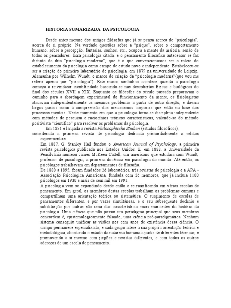 Na verdade questes sobre a psique, sobre o comportamento humano, sobre a percepo, fantasias, sonhos, etc., ocupou a mente da maioria, seno de todos os pensadores. Essa psicologia citada, e o pensamento filosfico antecessor se faz distinto da dita psicologia moderna, que o que convencionamos ser o incio do estabelecimento da psicologia como campo de estudo novo e independente. Estabeleceu-se ser a criao do primeiro laboratrio de psicologia, em 1879 na universidade de Leipzip, Alemanha por Wilhelm Wundt, o marco de criao da psicologia moderna(que vou me referir apenas por psicologia). Este marco simblico acontece quando a psicologia comea a reivindicar cientificidade baseando-se nas descobertas fsicas e biolgicas do final dos sculos XVII a XIX. Enquanto os filsofos do sculo passado preparavam o caminho para a abordagem experimental do funcionamento da mente, os fisiologistas atacavam independentemente os mesmos problemas a partir de outra direo, e davam largos passos rumo compreenso dos mecanismos corporais que esto na base dos processos mentais. Neste momento em que a psicologia torna-se disciplina independente com mtodos de pesquisa e raciocnios tericos caractersticos, valendo-se do mtodo positivista cientfico para resolver os problemas da psicologia. Em 1881 lanada a revista Philosophische Studien (estudos filosficos), considerada a primeira revista de psicologia dedicada primordialmente a relatos experimentais. Em 1887, G. Stanley Hall fundou o American Journal of Psychology, a primeira revista psicolgica publicada nos Estados Unidos. E, em 1888, a Universidade da Pensilvnia nomeou James McKeen Cattell, um americano que estudara com Wundt, professor de psicologia, a primeira docncia em psicologia do mundo. At ento, os psiclogos trabalhavam em departamentos de filosofia. De 1880 a 1895, foram fundados 26 laboratrios, trs revistas de psicologia e a APA Associao Psicolgica Americana, fundada com 26 membros, que j inclua 1100 psiclogos em 1930 e mais de cem mil em 1991. A psicologia vem se expandindo desde ento e se ramificando em vrias escolas de pensamento. Em geral, os membros destas escolas trabalham os problemas comuns e compartilham uma orientao terica ou sistemtica. O surgimento de escolas de pensamentos diferentes, e por vezes simultneas, e o seu subseqente declnio e substituio por outras so uma das caractersticas mais marcantes da histria da psicologia. Uma cincia que no possui um paradigma principal que seus membros concordem , epistemologicamente falando, uma cincia pr-paradigmtica. Nenhum sistema conseguiu unificar as vises nos cem anos de existncia dessa cincia. O campo permanece especializado, e cada grupo adere sua prpria orientao terica e metodolgica, abordando o estudo da natureza humana a partir de diferentes tcnicas, e promovendo a si mesmo com jarges e revistas diferentes, e com todos os outros adereos de um escola de pensamento.