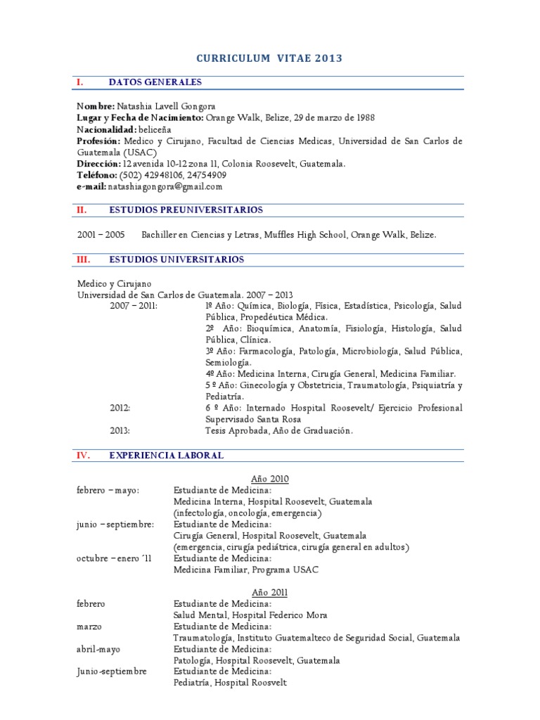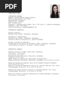 Nombre: Natashia Lavell Gongora Lugar y Fecha de Nacimiento: Orange Walk, Belize, 29 de marzo de 1988 Nacionalidad: belicea Profesin: Medico y Cirujano, Facultad de Ciencias Medicas, Universidad de San Carlos de Guatemala (USAC) Direccin: 12 avenida 10-12 zona 11, Colonia Roosevelt, Guatemala. Telfono: (502) 42948106, 24754909 e-mail: natashiagongora@[Link] II. ESTUDIOS PREUNIVERSITARIOS Bachiller en Ciencias y Letras, Muffles High School, Orange Walk, Belize.