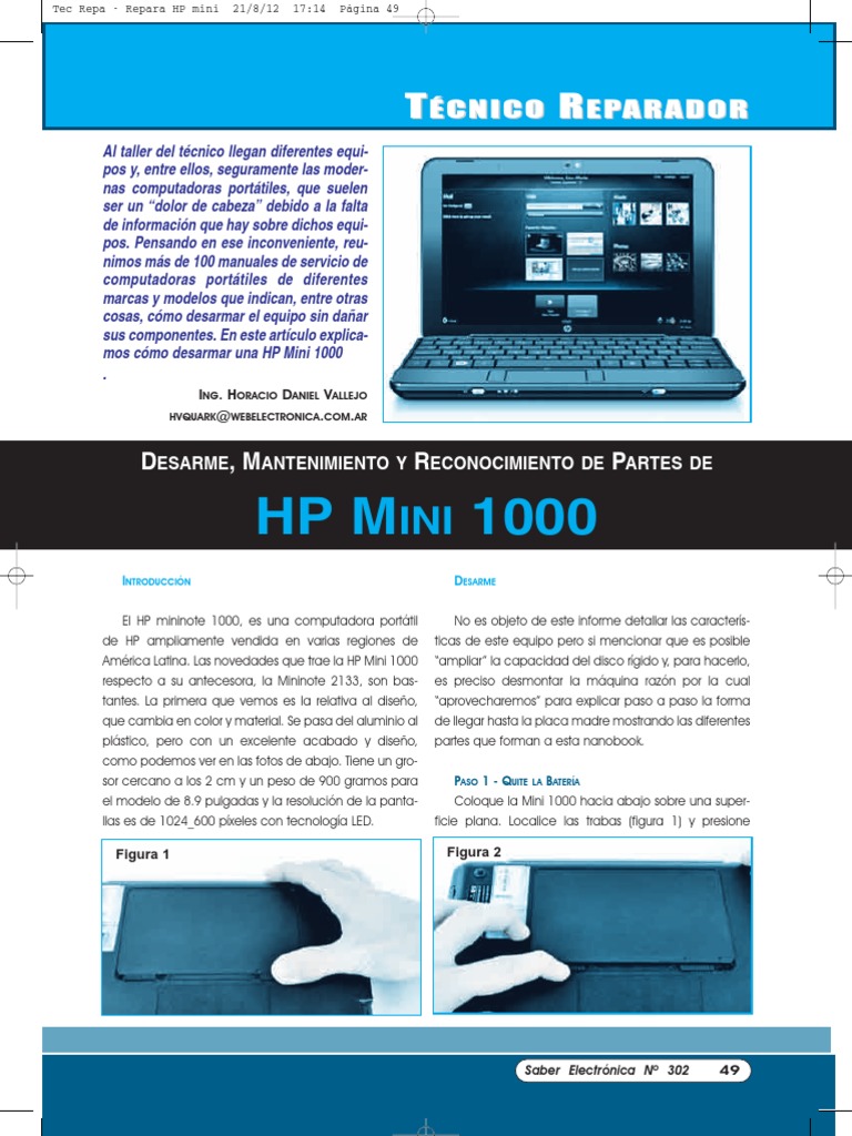 Al taller del tcnico llegan diferentes equipos y, entre ellos, seguramente las modernas computadoras porttiles, que suelen ser un dolor de cabeza debido a la falta de informacin que hay sobre dichos equipos. Pensando en ese inconveniente, reunimos ms de 100 manuales de servicio de computadoras porttiles de diferentes marcas y modelos que indican, entre otras cosas, cmo desarmar el equipo sin daar sus componentes. En este artculo explicamos cmo desarmar una HP Mini 1000 . ING. HORACIO DANIEL VALLEJO HVQUARK@WEBELECTRONICA.COM.AR