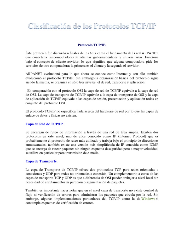 ste protocolo fue diseado a finales de los 60s como el fundamento de la red ARPANET que conectaba las computadoras de oficinas gubernamentales y universitarias. Funciona bajo el concepto de cliente servidor, lo que significa que alguna computadora pide los servicios de otra computadora; la primera es el cliente y la segunda el servidor. ARPANET evolucion para lo que ahora se conoce como Internet y con ello tambin evolucion el protocolo TCP/IP. Sin embargo la organizacin bsica del protocolo sigue siendo la misma, se organiza en slo tres niveles: el de red, transporte y aplicacin. En comparacin con el protocolo OSI la capa de red de TCP/IP equivale a la capa de red de OSI. La capa de transporte de TCP/IP equivale a la capa de transporte de OSI y la capa de aplicacin de TCP/IP equivale a las capas de sesin, presentacin y aplicacin todas en conjunto del protocolo OSI. El protocolo TCP/IP no especifica nada acerca del hardware de red por lo que las capas de enlace de datos y fsicas no existen. Capa de Red de TCP/IP. Se encargan de ruteo de informacin a travs de una red de rea amplia. Existen dos protocolos en este nivel, uno de ellos conocido como IP (Internet Protocol) que es probablemente el protocolo de ruteo ms utilizado y trabaja bajo el principio de direcciones enmascaradas; tambin existe una versin ms simplificada de IP conocida como ICMP que se encarga de rutear paquetes sin ningn esquema deseguridad pero a mayor velocidad, se utiliza en particular para transmisin de e-mails. Capa de Transporte. La capa de Transporte de TCP/IP ofrece dos protocolos: TCP para redes orientadas a conexiones y UDP para redes no orientadas a conexin. Un complementario a cerca de las capas de transporte TCP y UDP es que a diferencia de OSI pueden trabajar a nivel local sin necesidad de enrutamientos ni particin o segmentacin de paquetes. Tambin es importante hacer notar que en el nivel capa de transporte no existe control de flujo ni verificacin de errores para administrar los paquetes que circula por la red. Sin embargo, algunas implementaciones particulares del TCP/IP como la de Windows si contempla esquemas de verificacin de errores.
