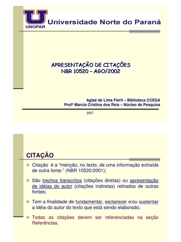 As citaes indiretas de diversos documentos de vrios autores, mencionados simultaneamente, devem ser separadas com ponto e vrgula, em ordem alfabtica (quando apresentar autoria fora do contexto). Quando apresentar a autoria no contexto, devem ser separados por e. Ex. 01 Citao Indireta (diversos documentos de vrios autores, com autoria no contexto) Sousa (1985, p. 97), Alves e Oliveira (2001, p. 62) e Silva (2002, p. 133) entendem que