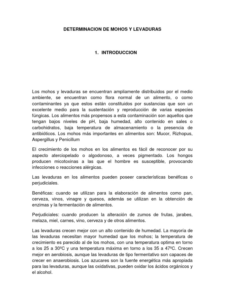 Los mohos y levaduras se encuentran ampliamente distribuidos por el medio ambiente, se encuentran como flora normal de un alimento, o como contaminantes ya que estos estn constituidos por sustancias que son un excelente medio para la sustentacin y reproduccin de varias especies fngicas. Los alimentos ms propensos a esta contaminacin son aquellos que tengan bajos niveles de pH, baja humedad, alto contenido en sales o carbohidratos, baja temperatura de almacenamiento o la presencia de antibiticos. Los mohos ms importantes en alimentos son: Mucor, Rizhopus, Aspergillus y Penicillum El crecimiento de los mohos en los alimentos es fcil de reconocer por su aspecto aterciopelado o algodonoso, a veces pigmentado. Los hongos producen micotoxinas a las que el hombre es susceptible, provocando infecciones o reacciones alrgicas. Las levaduras en los alimentos pueden poseer caractersticas benficas o perjudiciales. Benficas: cuando se utilizan para la elaboracin de alimentos como pan, cerveza, vinos, vinagre y quesos, adems se utilizan en la obtencin de enzimas y la fermentacin de alimentos. Perjudiciales: cuando producen la alteracin de zumos de frutas, jarabes, melaza, miel, carnes, vino, cerveza y de otros alimentos. Las levaduras crecen mejor con un alto contenido de humedad. La mayora de las levaduras necesitan mayor humedad que los mohos; la temperatura de crecimiento es parecido al de los mohos, con una temperatura optima en torno a los 25 a 30C y una temperatura mxima en torno a los 35 a 47C. Crecen mejor en aerobiosis, aunque las levaduras de tipo fermentativo son capaces de crecer en anaerobiosis. Los azucares son la fuente energtica ms apropiada para las levaduras, aunque las oxidativas, pueden oxidar los cidos orgnicos y el alcohol.