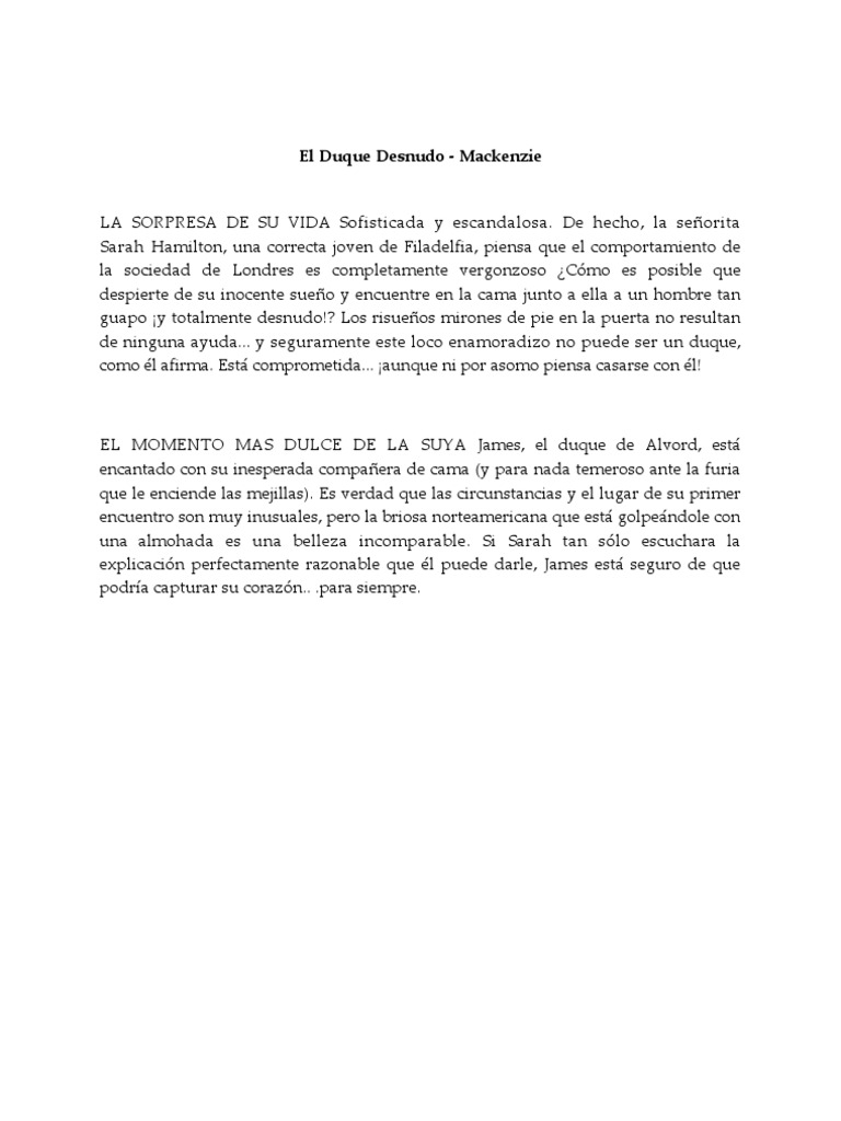 LA SORPRESA DE SU VIDA Sofisticada y escandalosa. De hecho, la seorita Sarah Hamilton, una correcta joven de Filadelfia, piensa que el comportamiento de la sociedad de Londres es completamente vergonzoso Cmo es posible que despierte de su inocente sueo y encuentre en la cama junto a ella a un hombre tan guapo y totalmente desnudo!? Los risueos mirones de pie en la puerta no resultan de ninguna ayuda... y seguramente este loco enamoradizo no puede ser un duque, como l afirma. Est comprometida... aunque ni por asomo piensa casarse con l! EL MOMENTO MAS DULCE DE LA SUYA James, el duque de Alvord, est encantado con su inesperada compaera de cama (y para nada temeroso ante la furia que le enciende las mejillas). Es verdad que las circunstancias y el lugar de su primer encuentro son muy inusuales, pero la briosa norteamericana que est golpendole con una almohada es una belleza incomparable. Si Sarah tan slo escuchara la explicacin perfectamente razonable que l puede darle, James est seguro de que podra capturar su corazn.. .para siempre.
