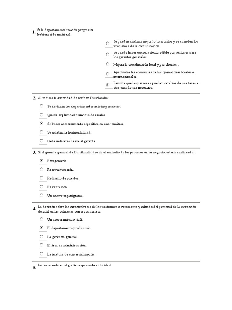 El organigrama utilizando el criterio funcional y territorial debe presentar: Un departamento que atienda a los clientes internos y reas en Argentina y EEUU. Un rea de comercio exterior y reas de produccin que atienda Argentina y Europa. Un departamento por lnea de productos y reas en Argentina y EEUU. Ninguna de las opciones es correcta. Un departamento por tipo de miel y reas en Argentina y Brasil. La . permite al gerente general de Dulcilancia, dedicarse a las actividades de ms importancia, en tanto que las funciones detalladas y rutinarias se delegan. Esta es una de las ventajas de la: Centralizacin. Autonoma. Automatizacin. Autoridad. Delegacin.