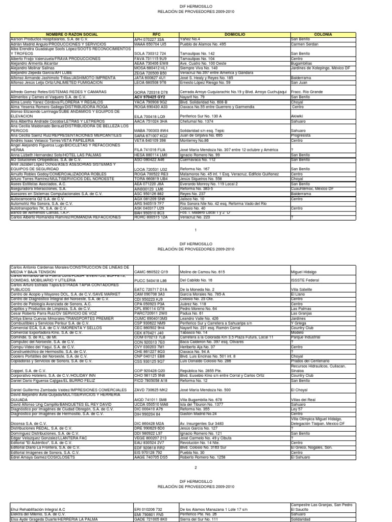 DIF HERMOSILLO RELACIN DE PROVEEDORES 2009-2010