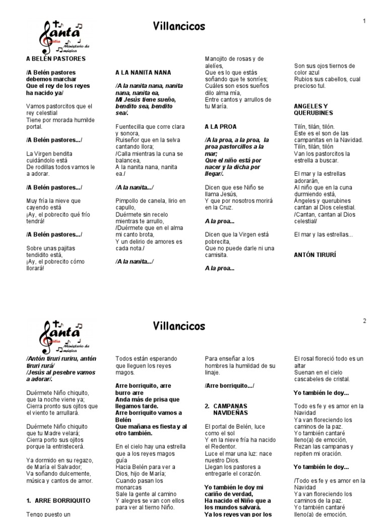 A BELN PASTORES /A Beln pastores debemos marchar Que el rey de los reyes ha nacido ya/ Vamos pastorcitos que el rey celestial Tiene por morada humilde portal. /A Beln pastores.../ La Virgen bendita cuidndolo est De rodillas todos vamos le a adorar. /A Beln pastores.../ Muy fra la nieve que cayendo est Ay, el pobrecito qu fro tendr! /A Beln pastores.../ Sobre unas pajitas tendidito est, Ay, el pobrecito cmo llorar! A LA NANITA NANA /A la nanita nana, nanita nana, nanita ea, Mi Jess tiene sueo, bendito sea, bendito sea/. Fuentecilla que corre clara y sonora, Ruiseor que en la selva cantando llora; /Calla mientras la cuna se balancea, A la nanita nana, nanita ea./ /A la nanita.../ Pimpollo de canela, lirio en capullo, Durmete sin recelo mientras te arrullo, /Durmete que en el alma mi canto brota, Y un delirio de amores es cada nota./ /A la nanita.../ A la proa... Manojito de rosas y de aleles, Que es lo que ests soando que te sonres; Cules son esos sueos dilo alma ma, Entre cantos y arrullos de tu Mara. A LA PROA /A la proa, a la proa, la proa pastorcillos a la mar; Que el nio est por nacer y la dicha por llegar/. Dicen que ese Nio se llama Jess, Y que por nosotros morir en la Cruz. A la proa... Dicen que la Virgen est pobrecita, Que no puede darle ni una camisita.