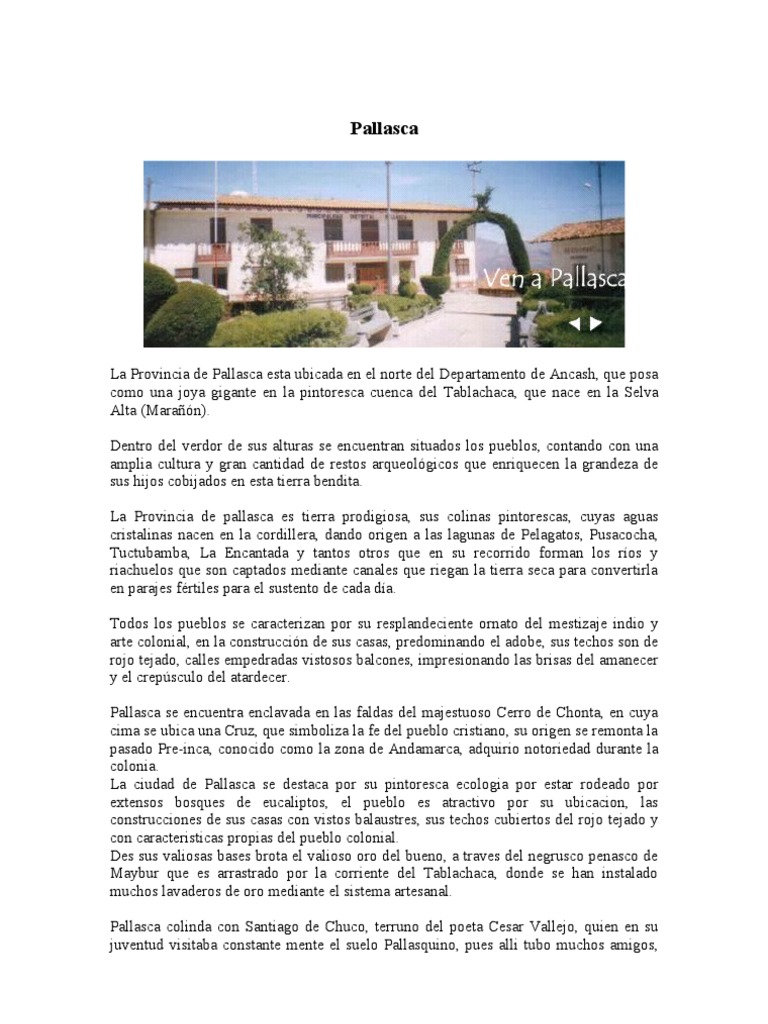 La Provincia de Pallasca esta ubicada en el norte del Departamento de Ancash, que posa como una joya gigante en la pintoresca cuenca del Tablachaca, que nace en la Selva Alta (Maran). Dentro del verdor de sus alturas se encuentran situados los pueblos, contando con una amplia cultura y gran cantidad de restos arqueolgicos que enriquecen la grandeza de sus hijos cobijados en esta tierra bendita. La Provincia de pallasca es tierra prodigiosa, sus colinas pintorescas, cuyas aguas cristalinas nacen en la cordillera, dando origen a las lagunas de Pelagatos, Pusacocha, Tuctubamba, La Encantada y tantos otros que en su recorrido forman los ros y riachuelos que son captados mediante canales que riegan la tierra seca para convertirla en parajes frtiles para el sustento de cada da. Todos los pueblos se caracterizan por su resplandeciente ornato del mestizaje indio y arte colonial, en la construccin de sus casas, predominando el adobe, sus techos son de rojo tejado, calles empedradas vistosos balcones, impresionando las brisas del amanecer y el crepsculo del atardecer. Pallasca se encuentra enclavada en las faldas del majestuoso Cerro de Chonta, en cuya cima se ubica una Cruz, que simboliza la fe del pueblo cristiano, su origen se remonta la pasado Pre-inca, conocido como la zona de Andamarca, adquirio notoriedad durante la colonia. La ciudad de Pallasca se destaca por su pintoresca ecologia por estar rodeado por extensos bosques de eucaliptos, el pueblo es atractivo por su ubicacion, las construcciones de sus casas con vistos balaustres, sus techos cubiertos del rojo tejado y con caracteristicas propias del pueblo colonial. Des sus valiosas bases brota el valioso oro del bueno, a traves del negrusco penasco de Maybur que es arrastrado por la corriente del Tablachaca, donde se han instalado muchos lavaderos de oro mediante el sistema artesanal. Pallasca colinda con Santiago de Chuco, terruno del poeta Cesar Vallejo, quien en su juventud visitaba constante mente el suelo Pallasquino, pues alli tubo muchos amigos,