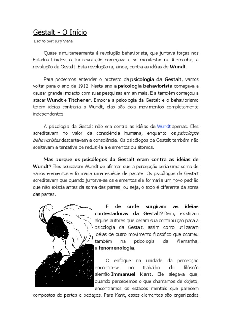 Quase simultaneamente revoluo behaviorista, que juntava foras nos Estados Unidos, outra revoluo comeava a se manifestar na Alemanha, a revoluo da Gestalt. Esta revoluo ia, ainda, contra as idias de Wundt. Para podermos entender o protesto da psicologia da Gestalt, vamos voltar para o ano de 1912. Neste ano a psicologia behaviorista comeava a causar grande impacto com suas pesquisas em animais. Ela tambm comeou a atacar Wundt e Titchener. Embora a psicologia da Gestalt e o behaviorismo terem idias contraria a Wundt, elas so dois movimentos completamente independentes. A psicologia da Gestalt no era contra as idias de Wundt apenas. Eles acreditavam no valor da conscincia humana, enquanto os psiclogos behavioristas descartavam a conscincia. Os psiclogos da Gestalt tambm no aceitavam a tentativa de reduzi-la a elementos ou tomos. Mas porque os psiclogos da Gestalt eram contra as idias de Wundt? Eles acusavam Wundt de afirmar que a percepo seria uma soma de vrios elementos e formaria uma espcie de pacote. Os psiclogos da Gestalt acreditavam que quando juntava-se os elementos ele formaria um novo padro que no existia antes da soma das partes, ou seja, o todo diferente da soma das partes. E de onde surgiram as idias contestadoras da Gestalt? Bem, existiram alguns autores que deram sua contribuio para a psicologia da Gestalt, assim como utilizaram idias de outro movimento filosfico que ocorreu tambm na psicologia da Alemanha, a fenomenologia. O enfoque na unidade da percepo encontra-se no trabalho do filsofo alemo Immanuel Kant. Ele alegava que, quando percebemos o que chamamos de objeto, encontramos os estados mentais que parecem compostos de partes e pedaos. Para Kant, esses elementos so organizados