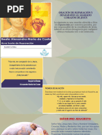que despus dejar huellas, cicatrices. Almas reparadoras que habis venido al Tabernculo de mi Amor Divino: interrumpid mi silencio con vuestra oracin; os estaba esperando; deseaba veros, abrazaros, susurraros palabras de amor. Almas reparadoras que habis venido al Tabernculo de mi Amor Divino: suavizad mi dolor con vuestra compaa; muy pocos han venido a visitarme. Me hallo prisionero por amor a vosotros. Soy el Mendigo del Amor que tan slo recibe migajas de cario. Almas reparadoras que habis venido al Tabernculo de mi Amor Divino: abrid vuestros labios y decidme muchos: te amo. Mi Corazn Eucarstico palpitar de amor; os cubrir con mis rayos y con la llama de mi Amor Divino. Almas reparadoras que habis venido al Tabernculo de mi Amor Divino: escuchad mis gemidos, mis ruegos; busco almas generosas que vengan a adorarme, pero no las encuentro; busco almas caritativas que vengan a sanar mis Sagradas Llagas, pero pasan de largo; mi dolor no las conmueve. Almas reparadoras que habis venido al Tabernculo de mi Amor Divino: traedme almas a uno de los Aposentos de mi Divino Corazn; almas que deseo cubrir con mis besos y con mis abrazos; almas a las que les purificar su corazn en los Ros de agua viva. Almas a las que les har sentir mi presencia como susurros de brisa suave; almas a las que alimentar con el man de ngeles; almas que recobrarn vigor, salud; almas que no volvern a sentirse desprotegidas porque caminar junto a ellas. Setiembre 9/09 (10.30 a.m.) Alma Reparadora: Corazn Eucarstico de mi Jess: aqu estoy frente a vuestro Tabernculo de Amor Divino. Escuch el suave eco de vuestra voz. Mi corazn arda en deseos de veros, de sentiros muy cerca de m; por eso miradme postrado ante vuestros pies, adorndoos como a mi Seor; glorificndoos como a mi Dios y tributndoos todo el honor que os merecis, por no habernos dejado solos; vuestra presencia siempre me acompaar todos los das de mi vida. Corazn Eucarstico de mi Jess: aqu estoy frente a vuestro Tabernculo de Amor Divino. Escuch vuestras pulsaciones de amor; por eso me alej de mis habituales ocupaciones para adentrarme en los silencios de Dios y aquietar mi espritu, de tal modo, que con mi presencia amaine vuestra soledad; soledad que os abruma, os llena de tristeza porque os quedasteis en todos los Sagrarios del mundo pensando en cada uno de nosotros, ya