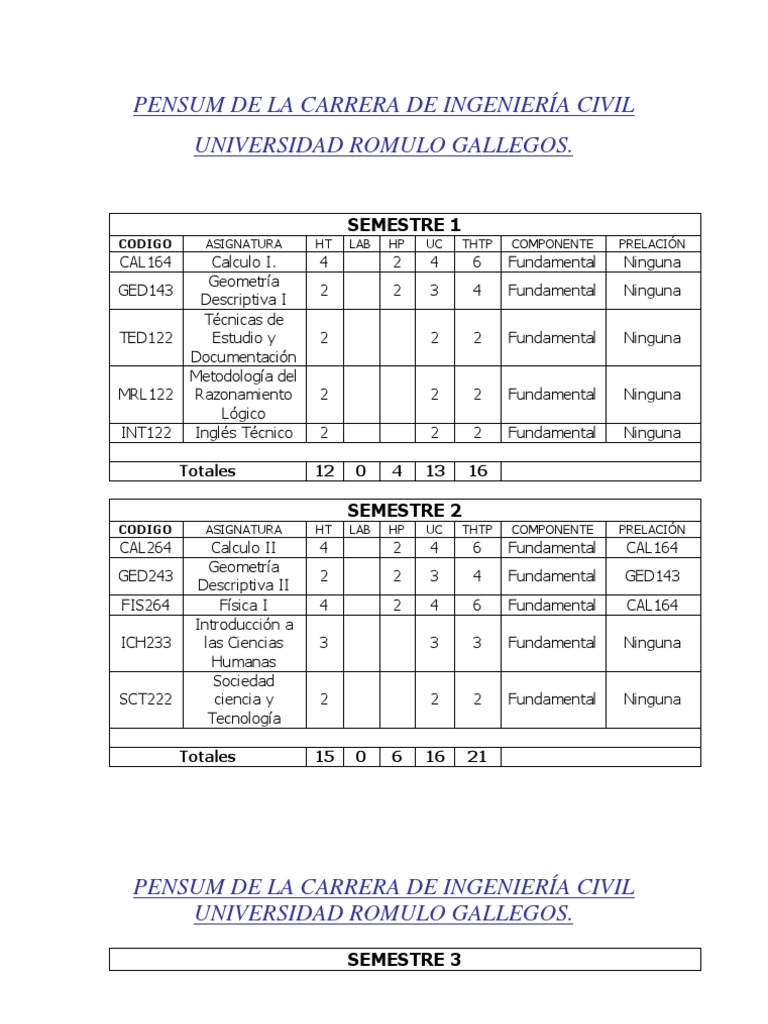 PENSUM DE LA CARRERA DE INGENIERA CIVIL UNIVERSIDAD ROMULO GALLEGOS.