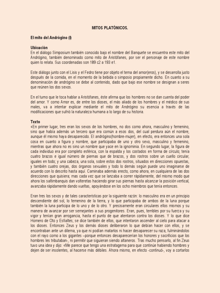 El mito del Andrgino (I) Ubicacin En el dilogo Simposium tambin conocido bajo el nombre del Banquete se encuentra este mito del Andrgino, tambin denominado como mito de Aristfanes, por ser el personaje de este nombre quien lo relata. Sus coordenadas son 189 c2 a 193 e1. Este dilogo junto con el Lisis y el Fedro tiene por objeto el tema del amor(eros), y se desarrolla justo despus de la comida, en el momento de la bebida o simposio propiamente dicho. En cuanto a su denominacin de andrgino se debe al contenido, dado que bajo ese nombre se designan a seres que renen los dos sexos. En el turno que le toca hablar a Aristfanes, ste afirma que los hombres no se dan cuenta del poder del amor. Y como Amor es, de entre los dioses, el ms aliado de los hombres y el mdico de sus males, va a intentar explicar mediante el mito de Andrgino su esencia a travs de las modificaciones que sufri la naturaleza humana a lo largo de su historia. Texto En primer lugar, tres eran los sexos de los hombres, no dos como ahora, masculino y femenino, sino que haba adems un tercero que era comn a esos dos, del cual perdura an el nombre, aunque l mismo haya desaparecido. El andrgino(hombre-mujer), en efecto, era entonces una sola cosa en cuanto a figura y nombre, que participaba de uno y otro sexo, masculino y femenino, mientras que ahora no es sino un nombre que yace en la ignominia. En segundo lugar, la figura de cada individuo era por completo esfrica, con la espalda y los costados en forma de crculo; tena cuatro brazos e igual nmero de piernas que de brazos, y dos rostros sobre un cuello circular, iguales en todo; y una cabeza, una sola, sobre estos dos rostros, situados en direcciones opuestas, y tambin cuatro orejas, dos rganos sexuales y todo lo dems segn puede uno imaginarse de acuerdo con lo descrito hasta aqu. Caminaba adems erecto, como ahora, en cualquiera de las dos direcciones que quisiera; mas cada vez que se lanzaba a correr rpidamente, del mismo modo que ahora los saltimbanquis dan volteretas haciendo girar sus piernas hasta alcanzar la posicin vertical, avanzaba rpidamente dando vueltas, apoyndose en los ocho miembros que tena entonces. Eran tres los sexos y de tales caractersticas por la siguiente razn: lo masculino era en un principio descendiente del sol, lo femenino de la tierra, y lo que participaba de ambos de la luna porque tambin la luna participa de lo uno y de lo otro. Y precisamente eran circulares ellos mismos y su manera de avanzar por ser semejantes a sus progenitores. Eran, pues, terribles por su fuerza y su vigor y tenan gran arrogancia, hasta el punto de que atentaron contra los dioses. Y lo que dice Homero de Oto y Esfialtes; se dice tambin de ellos, que intentaron ascender al cielo para atacar a los dioses. Entonces Zeus y los dems dioses deliberaron lo que deban hacer con ellos, y se encontraban ante un dilema, ya que ni podan matarlos ni hacer desaparecer su raza, fulminndolos con el rayo como a los gigantes porque entonces desapareceran los honores y sacrificios que los hombres les tributaban-, ni permitir que siguieran siendo altaneros. Tras mucho pensarlo, al fin Zeus tuvo una idea y dijo: Me parece que tengo una estratagema para que contine habiendo hombres y dejen de ser insolentes, al hacerse ms dbiles. Ahora mismo, en efecto -continu-, voy a cortarlos