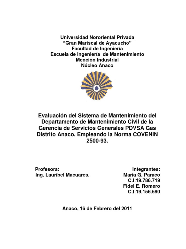 Evaluacin del Sistema de Mantenimiento del Departamento de Mantenimiento Civil de la Gerencia de Servicios Generales PDVSA Gas Distrito Anaco, Empleando la Norma COVENIN 2500-93.
