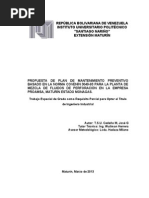 clara y detallada, existen programas de mantenimiento y se cumplen con la frecuencia estipulada, se cuenta con un personal idneo, se tiene claramente identificados los sistemas que involucran el mantenimiento rutinario y por ltimo se tiene establecida una supervisin para el control de la ejecucin de las actividades de mantenimiento rutinario. Control y Evaluacin: se controlan la ejecucin de mantenimiento programado, el personal encargado de las labores de recoleccin de informacin est capacitado con el fin de realizar evaluaciones peridicas de este tipo de mantenimiento. Las debilidades que presentan esta rea son las siguientes: la empresa no posee un estudio donde se especifiquen las necesidades reales y objetivas para los diferentes objetos de mantenimiento, no se ha determinado la fuerza laboral necesaria para llevar a cabo las actividades de mantenimiento y no existe una planificacin conjunta entre la organizacin de mantenimiento, produccin, administracin y otros entes de la organizacin, las actividades no estn programadas durante todas las semanas del ao, no existen estudios de las condiciones reales del funcionamiento de los equipo no se lleva un procedimiento de implantacin de los planes de mantenimiento, no se llevan fichas, planillas, formatos, entre otros instrumentos de control que permitan la recopilacin de informacin.