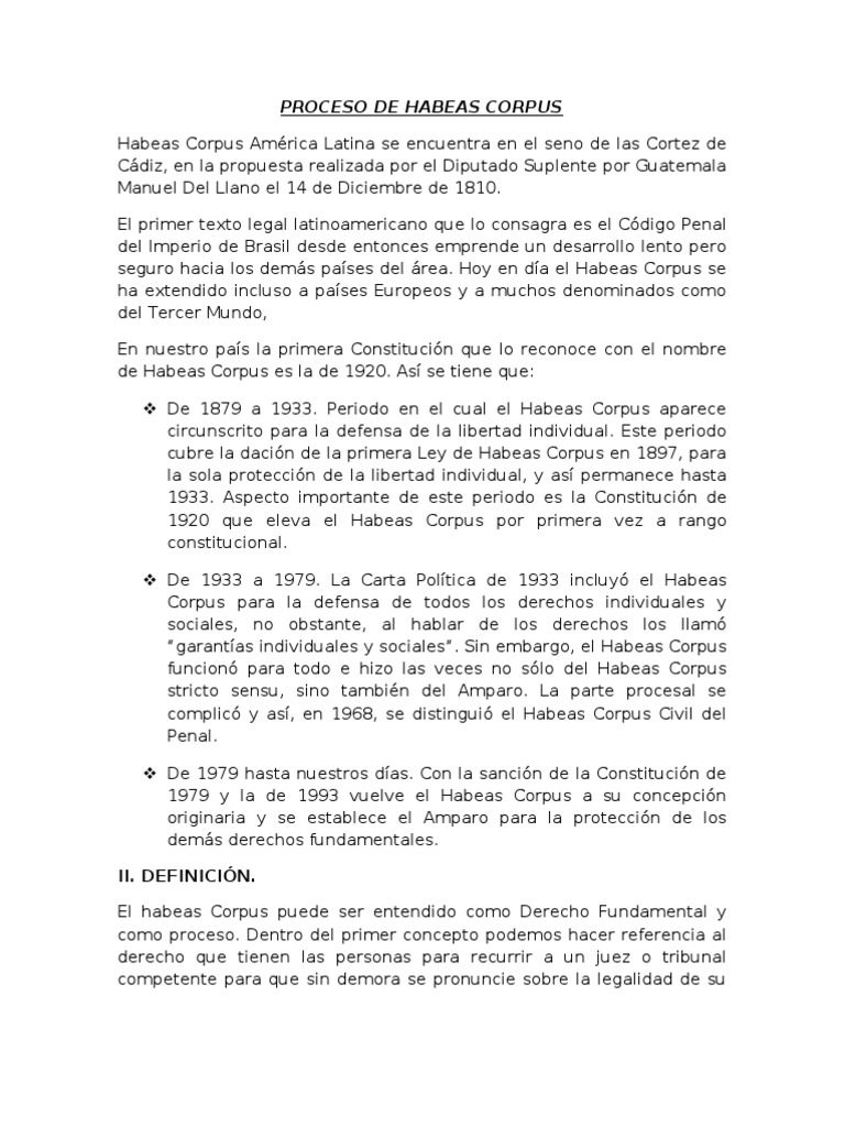 el Diputado Suplente por Guatemala Manuel Del Llano el 14 de Diciembre de 1810. El primer texto legal latinoamericano que lo consagra es el Cdigo Penal del Imperio de Brasil desde entonces emprende un desarrollo lento pero seguro hacia los dems pases del rea. Hoy en da el Habeas Corpus se ha extendido incluso a pases Europeos y a muchos denominados como del Tercer Mundo, En nuestro pas la primera Constitucin que lo reconoce con el nombre de Habeas Corpus es la de 1920. As se tiene que: De 1879 a 1933. Periodo en el cual el Habeas Corpus aparece circunscrito para la defensa de la libertad individual. Este periodo cubre la dacin de la primera Ley de Habeas Corpus en 1897, para la sola proteccin de la libertad individual, y as permanece hasta 1933. Aspecto importante de este periodo es la Constitucin de 1920 que eleva el Habeas Corpus por primera vez a rango constitucional. De 1933 a 1979. La Carta Poltica de 1933 incluy el Habeas Corpus para la defensa de todos los derechos individuales y sociales, no obstante, al hablar de los derechos los llam garantas individuales y sociales. Sin embargo, el Habeas Corpus funcion para todo e hizo las veces no slo del Habeas Corpus stricto sensu, sino tambin del Amparo. La parte procesal se complic y as, en 1968, se distingui el Habeas Corpus Civil del Penal. De 1979 hasta nuestros das. Con la sancin de la Constitucin de 1979 y la de 1993 vuelve el Habeas Corpus a su concepcin originaria y se establece el Amparo para la proteccin de los dems derechos fundamentales. II. DEFINICIN. El habeas Corpus puede ser entendido como Derecho Fundamental y como proceso. Dentro del primer concepto podemos hacer referencia al derecho que tienen las personas para recurrir a un juez o tribunal competente para que sin demora se pronuncie sobre la legalidad de su