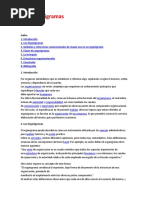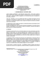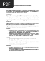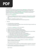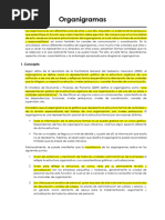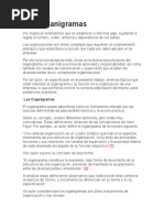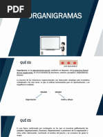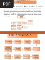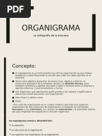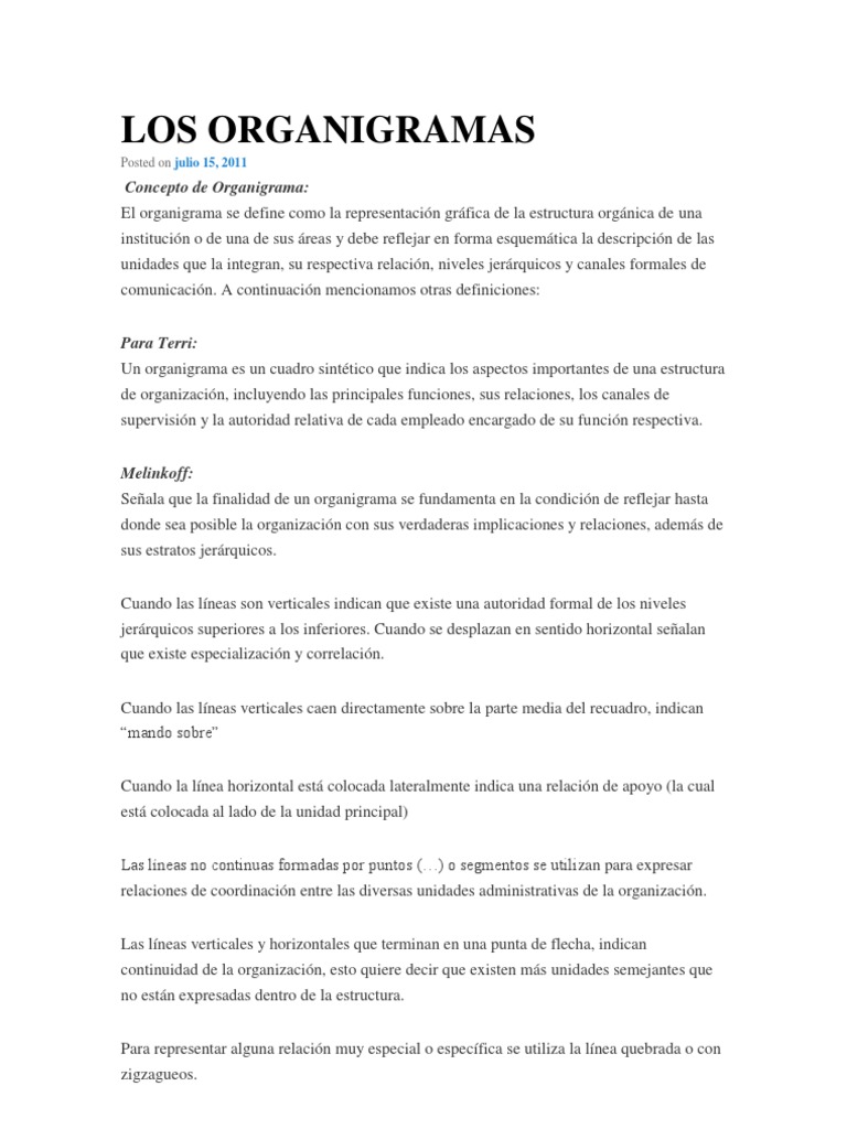 Concepto de Organigrama: El organigrama se define como la representacin grfica de la estructura orgnica de una institucin o de una de sus reas y debe reflejar en forma esquemtica la descripcin de las unidades que la integran, su respectiva relacin, niveles jerrquicos y canales formales de comunicacin. A continuacin mencionamos otras definiciones: Para Terri: Un organigrama es un cuadro sinttico que indica los aspectos importantes de una estructura de organizacin, incluyendo las principales funciones, sus relaciones, los canales de supervisin y la autoridad relativa de cada empleado encargado de su funcin respectiva. Melinkoff: Seala que la finalidad de un organigrama se fundamenta en la condicin de reflejar hasta donde sea posible la organizacin con sus verdaderas implicaciones y relaciones, adems de sus estratos jerrquicos. Cuando las lneas son verticales indican que existe una autoridad formal de los niveles jerrquicos superiores a los inferiores. Cuando se desplazan en sentido horizontal sealan que existe especializacin y correlacin. Cuando las lneas verticales caen directamente sobre la parte media del recuadro, indican mando sobre Cuando la lnea horizontal est colocada lateralmente indica una relacin de apoyo (la cual est colocada al lado de la unidad principal) Las lneas no continuas formadas por puntos () o segmentos se utilizan para expresar relaciones de coordinacin entre las diversas unidades administrativas de la organizacin. Las lneas verticales y horizontales que terminan en una punta de flecha, indican continuidad de la organizacin, esto quiere decir que existen ms unidades semejantes que no estn expresadas dentro de la estructura. Para representar alguna relacin muy especial o especfica se utiliza la lnea quebrada o con zigzagueos.