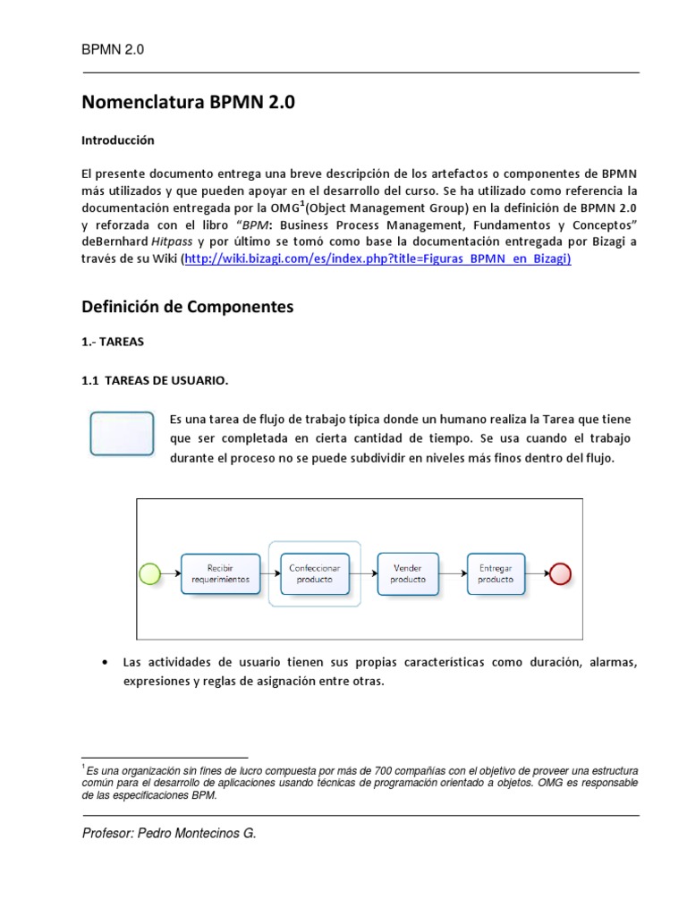 Introduccin El presente documento entrega una breve descripcin de los artefactos o componentes de BPMN ms utilizados y que pueden apoyar en el desarrollo del curso. Se ha utilizado como referencia la documentacin entregada por la OMG1(Object Management Group) en la definicin de BPMN 2.0 y reforzada con el libro BPM: Business Process Management, Fundamentos y Conceptos deBernhard Hitpass y por ltimo se tom como base la documentacin entregada por Bizagi a travs de su Wiki (http://wiki.bizagi.com/es/index.php?title=Figuras_BPMN_en_Bizagi)