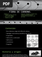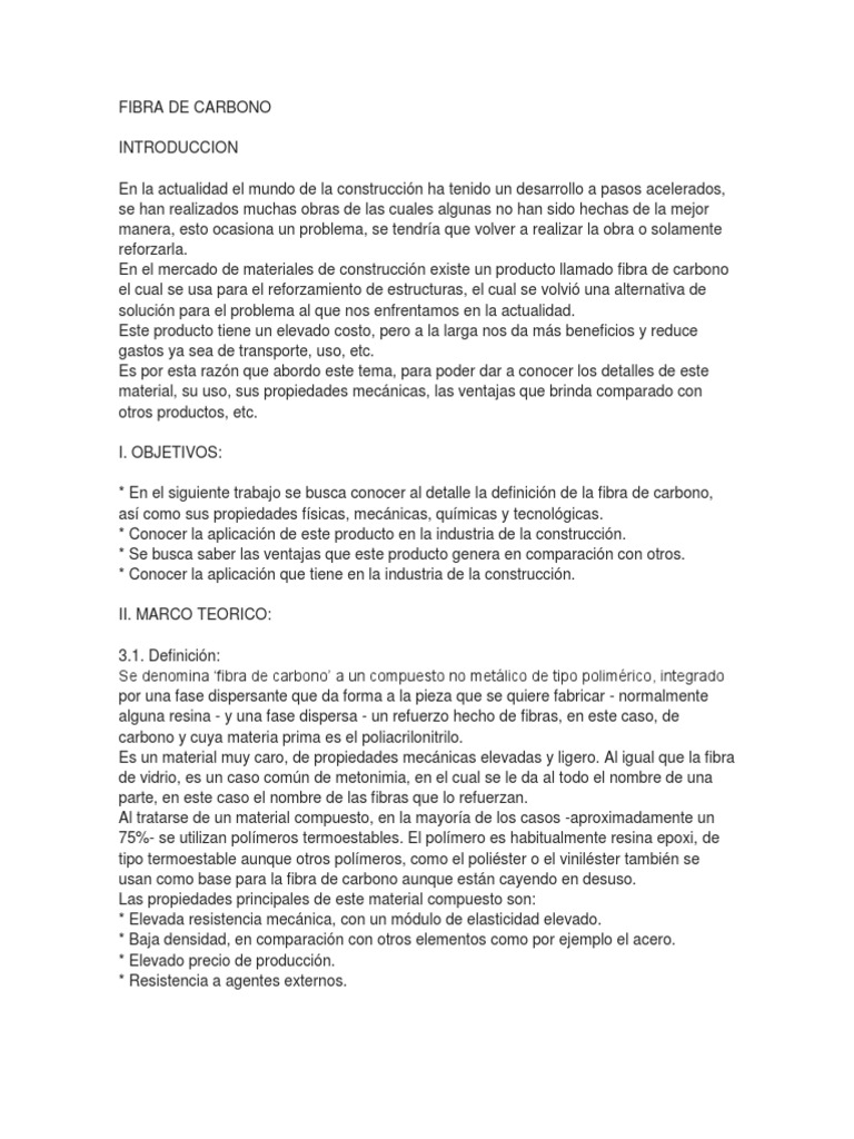 cuales algunas no han sido hechas de la mejor manera, esto ocasiona un problema, se tendra que volver a realizar la obra o solamente reforzarla. En el mercado de materiales de construccin existe un producto llamado fibra de carbono el cual se usa para el reforzamiento de estructuras, el cual se volvi una alternativa de solucin para el problema al que nos enfrentamos en la actualidad. Este producto tiene un elevado costo, pero a la larga nos da ms beneficios y reduce gastos ya sea de transporte, uso, etc. Es por esta razn que abordo este tema, para poder dar a conocer los detalles de este material, su uso, sus propiedades mecnicas, las ventajas que brinda comparado con otros productos, etc. I. OBJETIVOS: * En el siguiente trabajo se busca conocer al detalle la definicin de la fibra de carbono, as como sus propiedades fsicas, mecnicas, qumicas y tecnolgicas. * Conocer la aplicacin de este producto en la industria de la construccin. * Se busca saber las ventajas que este producto genera en comparacin con otros. * Conocer la aplicacin que tiene en la industria de la construccin. II. MARCO TEORICO: 3.1. Definicin: Se denomina fibra de carbono a un compuesto no metlico de tipo polimrico, integrado por una fase dispersante que da forma a la pieza que se quiere fabricar - normalmente alguna resina - y una fase dispersa - un refuerzo hecho de fibras, en este caso, de carbono y cuya materia prima es el poliacrilonitrilo. Es un material muy caro, de propiedades mecnicas elevadas y ligero. Al igual que la fibra de vidrio, es un caso comn de metonimia, en el cual se le da al todo el nombre de una parte, en este caso el nombre de las fibras que lo refuerzan. Al tratarse de un material compuesto, en la mayora de los casos -aproximadamente un 75%- se utilizan polmeros termoestables. El polmero es habitualmente resina epoxi, de tipo termoestable aunque otros polmeros, como el polister o el vinilster tambin se usan como base para la fibra de carbono aunque estn cayendo en desuso. Las propiedades principales de este material compuesto son: * Elevada resistencia mecnica, con un mdulo de elasticidad elevado. * Baja densidad, en comparacin con otros elementos como por ejemplo el acero. * Elevado precio de produccin. * Resistencia a agentes externos.