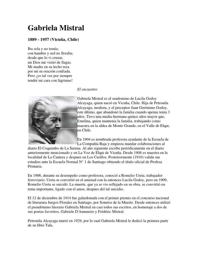 Iba sola y no tema; con hambre y sed no lloraba; desde que lo vi cruzar, mi Dios me visti de llagas. Mi madre en su lecho reza por m su oracin confiada. Pero yo tal vez por siempre tendr mi cara con lgrimas! El encuentro Gabriela Mistral es el seudonimo de Lucila Godoy Alcayaga, quien naci en Vicua, Chile. Hija de Petronila Alcayaga, modista, y el preceptor Juan Gernimo Godoy, este ltimo, que abandon la familia cuando apenas tena 3 aos. Tuvo una media-hermana quince aos mayor que, Emelina, quien mantenia la familia, trabajando como maestra en la aldea de Monte Grande, en el Valle de Elqui, en Chile. En 1904 es nombrada profesora ayudante de la Escuela de La Compaa Baja y empieza mandar colaboraciones al diario El Coquimbo de La Serena. Al ao siguiente escribe peridicamente en el diario anteriormente mencionado y en La Voz de Elqui de Vicua. Desde 1908 es maestra en la localidad de La Cantera y despues en Los Cerillos. Posteriormente (1910) valida sus estudios ante la Escuela Normal N 1 de Santiago obtiendo el ttulo oficial de Profesa Primaria. En 1906, durante su desempeo como profesora, conoci a Romelio Ureta, trabajador ferroviario. Ureta se convirti en el amistad con la entonces Lucila Godoy, pero en 1909, Romelio Ureta se suicid. La muerte, que ya se vio reflejado en su obra, se convirti en tema importante, ligado con el amor, despues del tal suicidio. El 12 de diciembre de 1914 fue galardonada con el primer premio en el concurso nacional de literarura Juegos Florales en Santiago, por Sonetos de la Muerte. Desde entonces utiliz el pseudnimo literario Gabriela Mistral en casi todos sus escritos, en homenaje a dos de sus poetas favoritos, Gabriele D'Annunzio y Frdric Mistral. Petronila Alcayaga muri en 1929, por lo cual Gabriela Mistral le dedic la primera parte de su libro Tala.