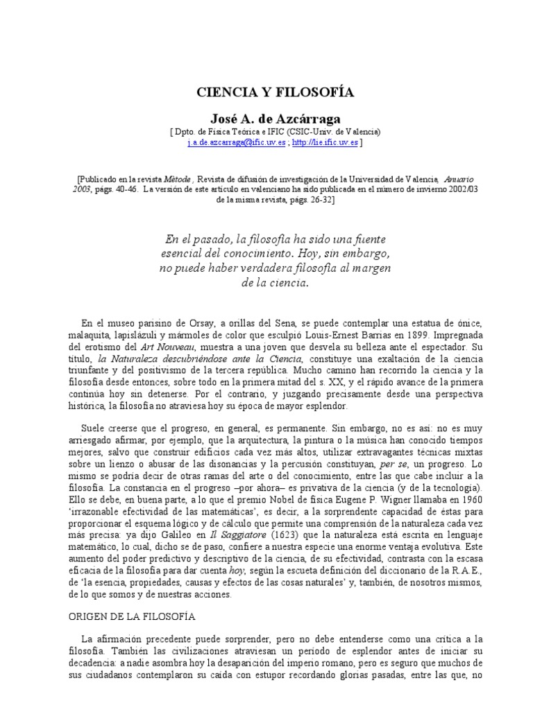 En el museo parisino de Orsay, a orillas del Sena, se puede contemplar una estatua de nice, malaquita, lapislzuli y mrmoles de color que esculpi Louis-Ernest Barrias en 1899. Impregnada del erotismo del Art Nouveau, muestra a una joven que desvela su belleza ante el espectador. Su ttulo, la Naturaleza descubrindose ante la Ciencia, constituye una exaltacin de la ciencia triunfante y del positivismo de la tercera repblica. Mucho camino han recorrido la ciencia y la filosofa desde entonces, sobre todo en la primera mitad del s. XX, y el rpido avance de la primera contina hoy sin detenerse. Por el contrario, y juzgando precisamente desde una perspectiva histrica, la filosofa no atraviesa hoy su poca de mayor esplendor. Suele creerse que el progreso, en general, es permanente. Sin embargo, no es as: no es muy arriesgado afirmar, por ejemplo, que la arquitectura, la pintura o la msica han conocido tiempos mejores, salvo que construir edificios cada vez ms altos, utilizar extravagantes tcnicas mixtas sobre un lienzo o abusar de las disonancias y la percusin constituyan, per se, un progreso. Lo mismo se podra decir de otras ramas del arte o del conocimiento, entre las que cabe incluir a la filosofa. La constancia en el progreso por ahora es privativa de la ciencia (y de la tecnologa). Ello se debe, en buena parte, a lo que el premio Nobel de fsica Eugene P. Wigner llamaba en 1960 irrazonable efectividad de las matemticas, es decir, a la sorprendente capacidad de stas para proporcionar el esquema lgico y de clculo que permite una comprensin de la naturaleza cada vez ms precisa: ya dijo Galileo en Il Saggiatore (1623) que la naturaleza est escrita en lenguaje matemtico, lo cual, dicho se de paso, confiere a nuestra especie una enorme ventaja evolutiva. Este aumento del poder predictivo y descriptivo de la ciencia, de su efectividad, contrasta con la escasa eficacia de la filosofa para dar cuenta hoy, segn la escueta definicin del diccionario de la R.A.E., de la esencia, propiedades, causas y efectos de las cosas naturales y, tambin, de nosotros mismos, de lo que somos y de nuestras acciones. ORIGEN DE LA FILOSOFA La afirmacin precedente puede sorprender, pero no debe entenderse como una crtica a la filosofa. Tambin las civilizaciones atraviesan un perodo de esplendor antes de iniciar su decadencia: a nadie asombra hoy la desaparicin del imperio romano, pero es seguro que muchos de sus ciudadanos contemplaron su cada con estupor recordando glorias pasadas, entre las que, no