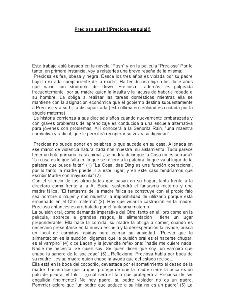 Este trabajo est basado en la novela Push y en la pelcula [Link] lo tanto, en primera instancia, voy a relatarles una breve resea de la misma: Preciosa es fea, obesa y negra. Desde los tres aos es violada por su padre bajo la mirada complaciente de la madre. Ha tenido una hija a los doce aos que naci con sndrome de Down. Preciosa adems, es golpeada frecuentemente por su madre quien la insulta y la acusa de haberle robado a su hombre. La obliga a realizar las tareas domsticas mientras ella se mantiene con la asignacin econmica que el gobierno destina supuestamente a Preciosa y a su hijita discapacitada (esta ltima en realidad es cuidada por la abuela materna) La historia comienza a sus diecisis aos cuando nuevamente embarazada y con graves problemas de aprendizaje es conducida a una escuela alternativa para jvenes con problemas. All conocer a la Seorita Rain, una maestra combativa y radical, que le permitir recuperar su voz y su dignidad. Preciosa no puede poner en palabras lo que sucede en su casa. Alienada en ese marco de violencia naturalizada nos muestra su aislamiento .Todo parece tener un tinte primario, casi animal se podra decir que la Cosa no es borrada? La cosa es lo que falta en lo que se refiere a la palabra, lo que va al lugar de la palabra que puede faltar (1) La Cosa, das Ding es una funcin operacional, por lo tanto la madre puede ir a este lugar, y en este caso tendramos que escribir Madre con mayscula (2) Con el silencio de las atrocidades que pasan en su hogar, tanto frente a la directora como frente a la A. Social sostendr el fantasma materno y una madre flica. El fantasma de la madre flica se construye con el propio falo sea hombre o mujer y nos muestra la imposibilidad de utilizarlo porque est empeado en el Otro materno (3). Hay que velar la castracin en la madre. Preciosa entonces es arrebatada por el fantasma materno. La pulsin oral, como demanda imperativa del Otro, tanto en el libro como en la pelcula, aparece a grandes rasgos, la alimentacin tiene un lugar preponderante. Ella hace la comida, su madre la obliga a comer, cuando es necesario presentarse en la nueva escuela y la desesperacin la invade, busca un local de comidas rpidas para calmar su ansiedadPuesto que la alimentacin es la succin, digamos que la pulsin oral es el hacerse chupar, es el vampiro (4) dice Lacan y la jovencita reflexiona: nadie me quiere nada. Nadie me necesita. S quien soy. S quien dicen que soy...un vampiro que chupa la sangre de la sociedad (5)Reflexiono: Preciosa habla por boca de su madrees su madre quien chupa la ayuda que del estado recibe Ella est en la boca del cocodrilo, devastada por el sometimiento al deseo de la madre. Lacan dice que lo que protege de que la madre cierre la boca es un palo de piedra, el falo cul ser el falo que proteger a Preciosa de ser engullida finalmente? No hay padre, su padre violador no es un padre. Pommier aclara que un padre que seduce a su hija no es un padre (6) La