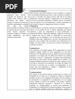 Certificacin: Por residir la responsabilidad exclusivamente en cabeza de contadores pblicos (cuyas manifestaciones son revestidas de verdad y certeza), los informes y documentos suscritos por el auditor tienen la calidad de certeza, es decir, tienen el sello de la fe pblica, de la refrenda de los hechos y de la atestacin. Integridad: Las tareas deben cubrir en forma integral todas las operaciones, reas, bienes, funciones y dems aspectos de carcter econmico, incluido su entorno. Contempla, al ente econmico como un todo compuesto por sus bienes, recursos, operaciones, resultados, etc. Planeamiento: Definir los objetivos de la Auditora, alcance y metodologa dirigida a conseguir esos logros. Supervisin: Personal adecuadamente supervisado para determinar si se estn alcanzando los objetivos de la auditora y obtener evidencia suficiente, competente y relevante, permitiendo una base razonable para las opiniones del auditor.