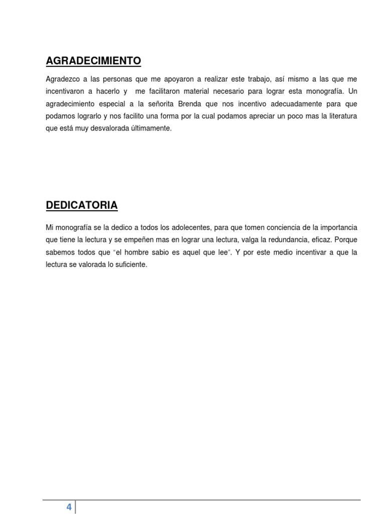 agradecimiento especial a la seorita Brenda que nos incentivo adecuadamente para que podamos lograrlo y nos facilito una forma por la cual podamos apreciar un poco mas la literatura que est muy desvalorada ltimamente.