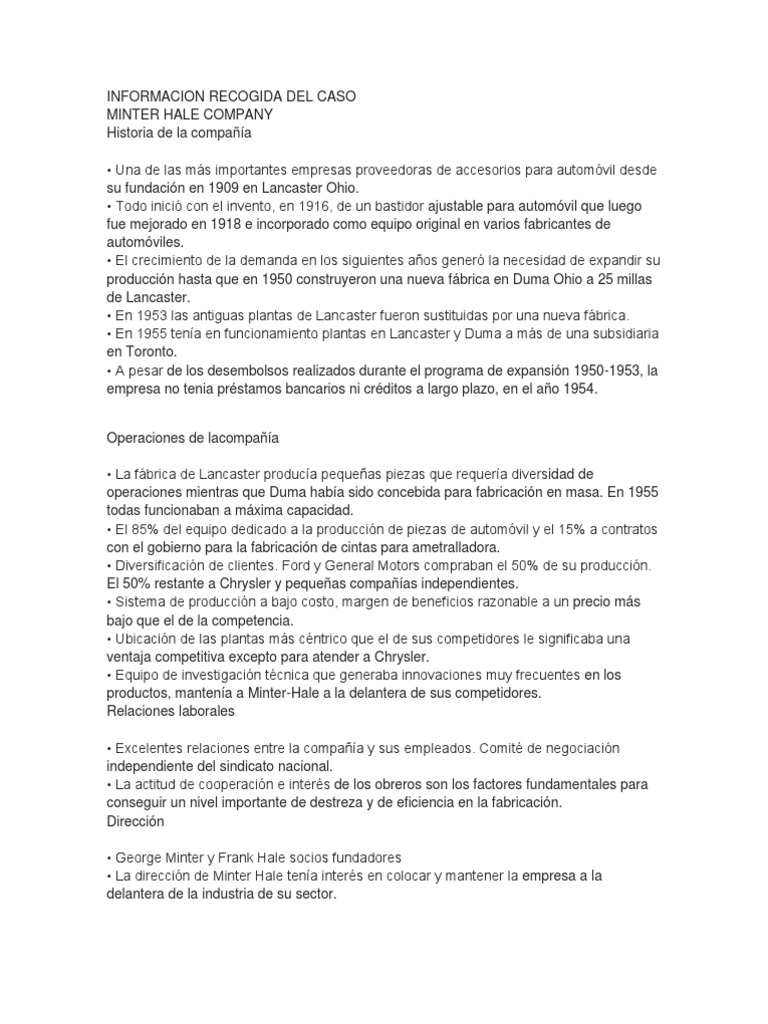 Operaciones de lacompaa La fbrica de Lancaster produca pequeas piezas que requera diversidad de operaciones mientras que Duma haba sido concebida para fabricacin en masa. En 1955 todas funcionaban a mxima capacidad. El 85% del equipo dedicado a la produccin de piezas de automvil y el 15% a contratos con el gobierno para la fabricacin de cintas para ametralladora. Diversificacin de clientes. Ford y General Motors compraban el 50% de su produccin. El 50% restante a Chrysler y pequeas compaas independientes. Sistema de produccin a bajo costo, margen de beneficios razonable a un precio ms bajo que el de la competencia. Ubicacin de las plantas ms cntrico que el de sus competidores le significaba una ventaja competitiva excepto para atender a Chrysler. Equipo de investigacin tcnica que generaba innovaciones muy frecuentes en los productos, mantena a Minter-Hale a la delantera de sus competidores. Relaciones laborales Excelentes relaciones entre la compaa y sus empleados. Comit de negociacin independiente del sindicato nacional. La actitud de cooperacin e inters de los obreros son los factores fundamentales para conseguir un nivel importante de destreza y de eficiencia en la fabricacin. Direccin George Minter y Frank Hale socios fundadores La direccin de Minter Hale tena inters en colocar y mantener la empresa a la delantera de la industria de su sector.