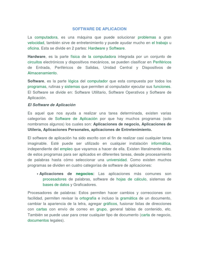 ayudar mucho en el trabajo u oficina. Esta se divide en 2 partes: Hardware y Software. Hardware, es la parte fsica de la computadora integrada por un conjunto de circuitos electrnicos y dispositivos mecnicos, se pueden clasificar en Perifricos de Entrada, Perifricos de Salidas, Unidad Central y Dispositivos de Almacenamiento. Software, es la parte lgica del computador que esta compuesta por todos los programas, rutinas y sistemas que permiten al computador ejecutar sus funciones. El Software se divide en: Software Utilitario, Software Operativos y Software de Aplicacin. El Software de Aplicacin Es aquel que nos ayuda a realizar una tarea determinada, existen varias categoras de Software de Aplicacin por que hay muchos programas (solo nombramos algunos) los cuales son: Aplicaciones de negocio, Aplicaciones de Utilera, Aplicaciones Personales, aplicaciones de Entretenimiento. El software de aplicacin ha sido escrito con el fin de realizar casi cualquier tarea imaginable. Est puede ser utilizado en cualquier instalacin informtica, independiente del empleo que vayamos a hacer de ella. Existen literalmente miles de estos programas para ser aplicados en diferentes tareas, desde procesamiento de palabras hasta cmo seleccionar una universidad. Como existen muchos programas se dividen en cuatro categoras de software de aplicaciones: