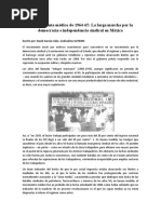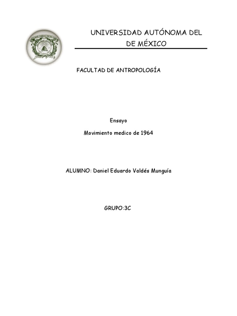 Alfredo Rustrin Azamar, l964-l965, es elocuente.El libro fue presentado en la Universidad Autnoma "Benito Jurez" de Oaxaca (UABJO) en el ao 2005 con bastante xito. Conclusiones En ese tiempo se poda ver como es que los jvenes eran los principales dirigentes de algunos movimientos que fue a la que se le llamo La generacin de la dcada de la contracultura pues estaba desencantada del mundo circundante. Haba descubierto que la guerra y la lucha por el poder conducan a una soledad intolerable trayendo consigo preguntas como Cul era el significado verdadero de la vida? Cmo llegar a su esencia? En contraste con el movimiento medico mexicano podemos observar como es que de alguna manera lo que los mdicos buscaban no era mas que unas condiciones mas optimas para poder desempear su trabajo de una mejor manera, de forma que las peticiones pacificas de los mdicos no surtan ningn efecto cosa que era extraa por que solo exigan lo que en algn momento Daz Ordaz prometi y mas all de lo que prometi ellos pedan lo que nicamente les corresponda por derecho como los aguinaldos. Aunque fueron cesados 206 inconformes en un principio se puede decir que gracias a este movimiento ahora podemos contar no con el optimo servicio por que seria quizs un mentira decirlo pero si podemos por lo menos presumir que aun haya mdicos trabajando en instituciones dependientes puesto que si no hubiese sido por este movimiento muy seguramente ahora no gozaramos ni de infraestructura ni de servicios mdicos, puesto que esto era lo nico que pedan los mdicos en 1964.