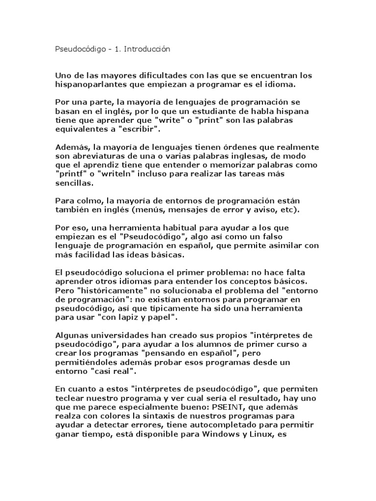 Introduccin Uno de las mayores dificultades con las que se encuentran los hispanoparlantes que empiezan a programar es el idioma. Por una parte, la mayora de lenguajes de programacin se basan en el ingls, por lo que un estudiante de habla hispana tiene que aprender que "write" o "print" son las palabras equivalentes a "escribir". Adems, la mayora de lenguajes tienen rdenes que realmente son abreviaturas de una o varias palabras inglesas, de modo que el aprendiz tiene que entender o memorizar palabras como "printf" o "writeln" incluso para realizar las tareas ms sencillas. Para colmo, la mayora de entornos de programacin estn tambin en ingls (mens, mensajes de error y aviso, etc). Por eso, una herramienta habitual para ayudar a los que empiezan es el "Pseudocdigo", algo as como un falso lenguaje de programacin en espaol, que permite asimilar con ms facilidad las ideas bsicas. El pseudocdigo soluciona el primer problema: no hace falta aprender otros idiomas para entender los conceptos bsicos. Pero "histricamente" no solucionaba el problema del "entorno de programacin": no existan entornos para programar en pseudocdigo, as que tpicamente ha sido una herramienta para usar "con lapiz y papel". Algunas universidades han creado sus propios "intrpretes de pseudocdigo", para ayudar a los alumnos de primer curso a crear los programas "pensando en espaol", pero permitindoles adems probar esos programas desde un entorno "casi real". En cuanto a estos "intrpretes de pseudocdigo", que permiten teclear nuestro programa y ver cual sera el resultado, hay uno que me parece especialmente bueno: PSEINT, que adems realza con colores la sintaxis de nuestros programas para ayudar a detectar errores, tiene autocompletado para permitir ganar tiempo, est disponible para Windows y Linux, es