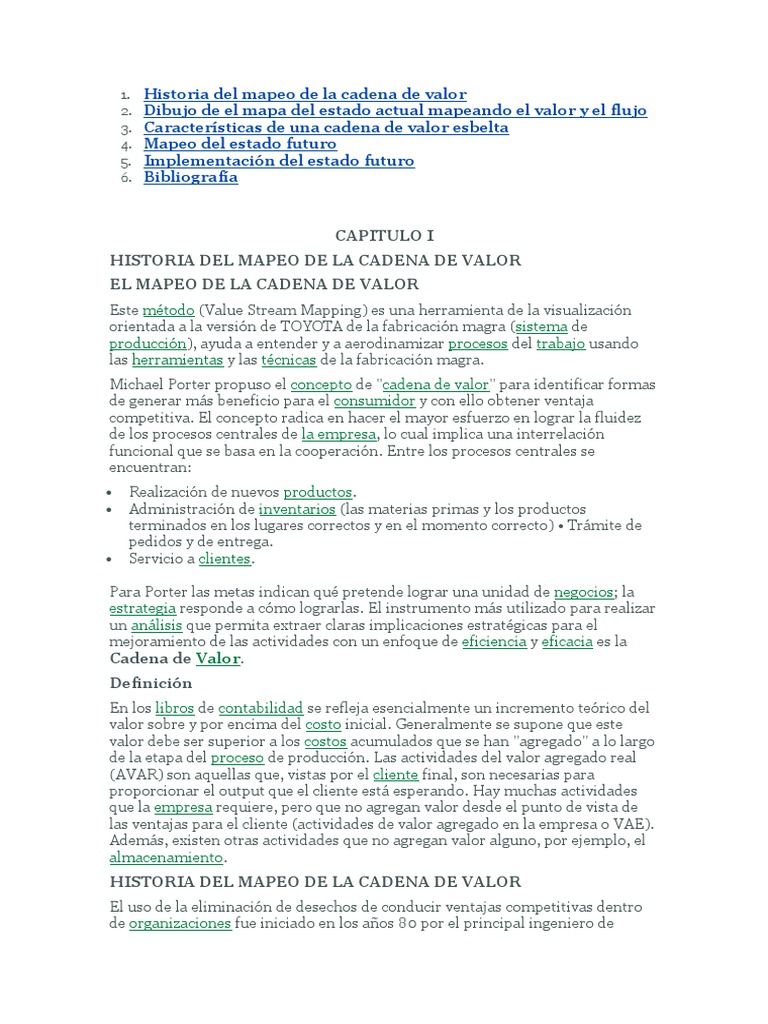 CAPITULO I HISTORIA DEL MAPEO DE LA CADENA DE VALOR EL MAPEO DE LA CADENA DE VALOR Este mtodo (Value Stream Mapping) es una herramienta de la visualizacin orientada a la versin de TOYOTA de la fabricacin magra (sistema de produccin), ayuda a entender y a aerodinamizar procesos del trabajo usando las herramientas y las tcnicas de la fabricacin magra. Michael Porter propuso el concepto de "cadena de valor" para identificar formas de generar ms beneficio para el consumidor y con ello obtener ventaja competitiva. El concepto radica en hacer el mayor esfuerzo en lograr la fluidez de los procesos centrales de la empresa, lo cual implica una interrelacin funcional que se basa en la cooperacin. Entre los procesos centrales se encuentran: