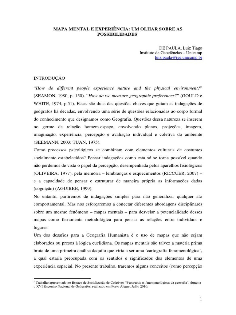 INTRODUO How do different people experience nature and the physical environment? (SEAMON, 1980, p. 150). How do we measure geographic preferences? (GOULD e WHITE, 1974, p.51). Essas so duas das questes chaves que guiam as indagaes de gegrafos h dcadas, envolvendo uma srie de questes relacionadas ao corpo formal do conhecimento que designamos como Geografia. Questes dessa natureza se inserem no germe da relao homem-espao, envolvendo planos, projees, imagem, imaginao, experincia, percepo e avaliao individual e coletiva do ambiente (SEEMANN, 2003; TUAN, 1975). Como processos psicolgicos se combinam com elementos culturais de costumes socialmente estabelecidos? Pensar indagaes como esta s se torna possvel quando no perdemos de vista o papel da percepo, desempenhada pelos aparelhos fisiolgicos (OLIVEIRA, 1977), pela memria lembranas e esquecimentos (RICCUER, 2007) e a capacidade de pensar e estruturar de maneira prpria as informaes dadas (cognio) (AGUIRRE, 1999). No entanto, partiremos de indagaes simples para no generalizar qualquer ato comportamental. Mas nos esforaremos a conectar diferentes abordagens disciplinares sobre um mesmo fenmeno mapas mentais para desvelar a potencialidade desses mapas como ferramenta metodolgica para pensar as relaes entre indivduos e lugares. Um dos desafios para a Geografia Humanista o uso de mapas que no sejam elaborados ou presos lgica euclidiana. Os mapas mentais so talvez a matria prima bruta de uma primeira anlise daquilo que viria a ser uma cartografia fenomenolgica, a qual estaria preocupada com os sentidos e significados dos elementos de uma experincia espacial. No presente trabalho, traremos alguns conceitos (como percepo