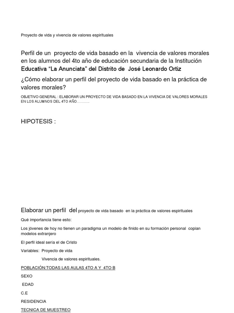 Perfil de un proyecto de vida basado en la vivencia de valores morales en los alumnos del 4to ao de educacin secundaria de la Institucin Educativa La Anunciata del Distrito de Jos Leonardo Ortiz Cmo elaborar un perfil del proyecto de vida basado en la prctica de valores morales?