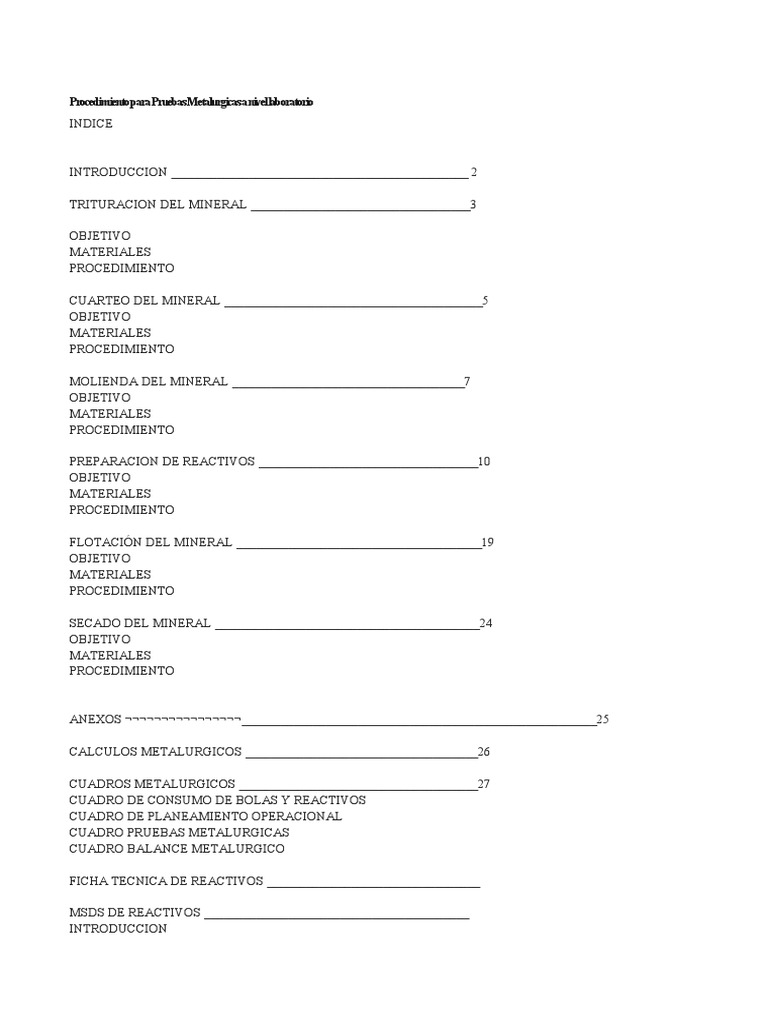 ProcedimientoparaPruebasMetalurgicasanivellaboratorio INDICE