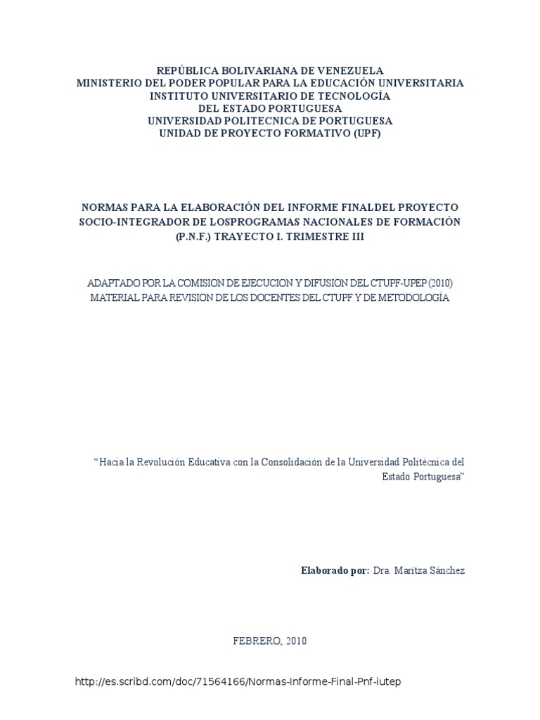 NORMAS PARA LA ELABORACIN DEL INFORME FINALDEL PROYECTO SOCIO-INTEGRADOR DE LOSPROGRAMAS NACIONALES DE FORMACIN (P.N.F.) TRAYECTO I. TRIMESTRE III