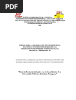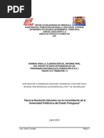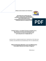 INSTRUCTIVO PARA LA ELABORACIN DEL INFORME FINAL DEL PROYECTO SOCIO INTEGRADOR DE LOS PROGRAMAS NACIONALES DE FORMACIN (P.N.F.) TRAYECTO I. TERCER TRIMESTRE ELEMENTOS DE ENTRADA QUE DEBE CONTENER EL INFORME: - PORTADA Cintillo de la institucin Logo de la institucin y de la Unidad de Proyecto Formativo al extremo a ambos lados Nombre del Programa Nacional de Formacin Ttulo del Proyecto Lnea de investigacin en la que se enmarca el proyecto Socio integrador Nombre de los Participantes, con sus nmeros de Cdula de Identidad Nombre del Docente Facilitador de la Unidad Curricular Proyecto Formativo Nombre del Tutor Externo o comunitario L u g a r y F e c h a d e e n t r e g a a l C o m i t T c n i c o d e l a U n i d a d d e P r o y e c t o Formativo. PAGINAS PRELIMINARES ndice General ndice de Cuadros (Opcional de acuerdo al tipo de proyecto desarrollado). ndice de Grficos (Opcional de acuerdo al tipo de proyecto desarrollado). Resumen del Proyecto. I PARTE DESCRIPCION DEL PROYECTO: MBITO FAMILIAR U ORGANIZACIONAL 1. DIAGNSTICO SITUACIONAL 1.1. Descripcin del Contexto: -Identificacin: de la familia u Organizacin (razn social). - Caractersticas: de la Estructura Familiar u Organizacin. - Localizacin Geogrfica: Estado, Municipio, Parroquia, Casero y Direccin. - Historia de Vida de la Familia u Organizacin: Breve resea histrica. - Nombre de las Organizaciones Vinculadas al Proyecto Familiar u Organizacional: Mencionar las organizaciones sociales y no sociales que Caracterizan la comunidad. 1.2. Problemas, Necesidades o Intereses del Contexto Familiar u Organizacional: - Descripcin del diagnstico situacional. - Jerarquizacin e identificacin de las necesidades f a m i l i a r e s u organizacionales. - Seleccin del problema o necesidad prioritaria. - Alternativas de Solucin.