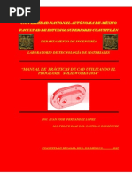 PROLOGO El dibujo en Mxico igual que en varios pases ha evolucionado considerablemente, desde las pinturas rupestres, hasta hoy da por medio de computadoras la ingeniera entre otras profesiones utiliza el sistema conocido como, CAD. El CAD es el proceso en el cual se utilizan computadoras de cualquier tipo que por medio de softwares facilitan y agilizan los trabajos de diseo y calculo. El dibujo computarizado es una herramienta para representar y describir grficamente un objeto. Esta herramienta utiliza un sistema de medicin exacto y acotaciones con medidas de longitud, altura, profundidad, ngulos, etc. Una herramienta CAD (dibujo asistido por computadora) es un software que aborda la automatizacin del proceso de diseo de un determinado tipo de construccin. El xito en la utilizacin de sistemas CAD se visualiza principalmente en la reduccin de tiempo invertido en el dibujo. Fundamentalmente por el uso de sistemas grficos, que permiten realizar las modificaciones en el modelo y observar los cambios producidos en el dibujo. El sistema CAD se basa en la representacin virtual del modelo. Esto permite realizar automticamente el dibujo, y ayuda en la utilizacin de mtodos para realizar simulaciones sobre el dibujo. El ciclo del diseo de un dibujo o pieza utilizando un sistema CAD se ve afectado, tan solo, por el tiempo que toma hacer bocetos y borradores. Esta simple modificacin supone un ahorro importante en la duracin del proceso de diseo. En Mxico durante los ltimos 15 aos, y con ms fuerza en los ltimos 10 aos, el dibujo asistido por computadora ha ido desplazando al dibujo hecho sobre papel en una mesa de dibujo en la preparacin de planos para proyectos. Es cuestin de poco tiempo para que todo delineante use algn programa de dibujo en una computadora para dibujar los planos. Ya casi todas las compaas de Ingeniera y arquitectura usan computadoras sustituyendo sus talleres de dibujos a mano; creo an as que la formacin ingenieril debe seguir considerando el saber dibujar manualmente haciendo lminas y bocetos con lpices y en blocks de dibujo, pues eso nos genera una percepcin e imaginacin mayor sobre ideas de diseo. El presente trata de ser de utilidad en la materia del laboratorio de Diseo Asistido por Computadora que se imparte en la Escuela Superior de Ingeniera Mecnica y Elctrica Unidad Azcapotzalco perteneciente al Instituto Politcnico Nacional (IPN); considerando una de las instituciones de vanguardia en la ingeniera de Mxico. SolidWorks es un software fcil de aprender a utilizar, por lo que el estudiante al consultar el presente y realizando las practicas comenzar a experimentar un inters sobre la materia y un aumento en la habilidad para la utilizacin del software. Las herramientas de flujo de trabajo, las funciones de gestin de datos y la facilidad de integracin con otras tecnologas contribuyen a que los estudiantes puedan colaborar, ahorrar tiempo y reducir errores de diseo. Cualquier informacin o comentario enviar a frodriguezl@ipn.mx