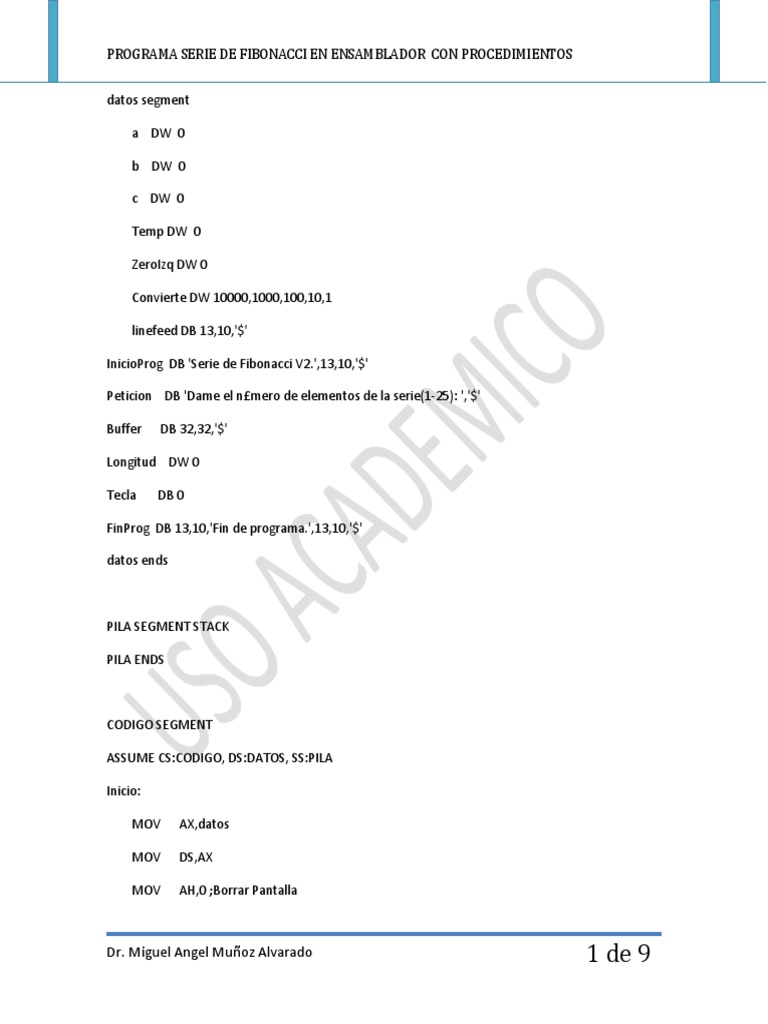PROGRAMA SERIE DE FIBONACCI EN ENSAMBLADOR CON PROCEDIMIENTOS datos segment a DW 0 b DW 0 c DW 0 Temp DW 0 ZeroIzq DW 0 Convierte DW 10000,1000,100,10,1 linefeed DB 13,10,'$' InicioProg