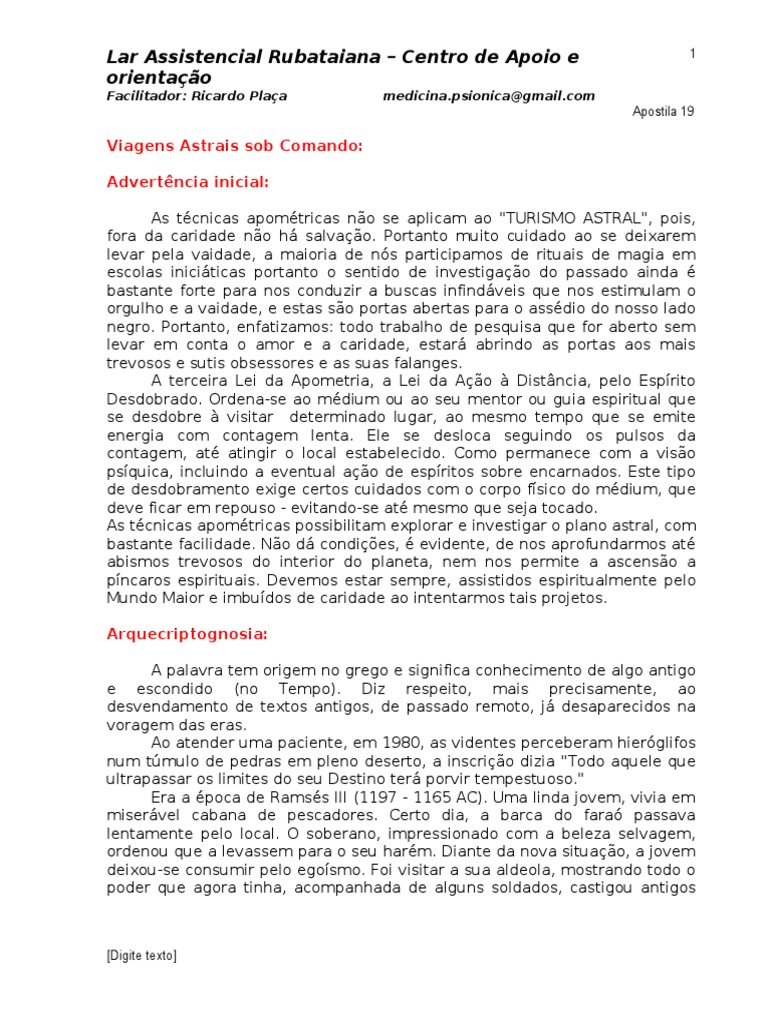 Viagens Astrais sob Comando: Advertncia inicial: As tcnicas apomtricas no se aplicam ao "TURISMO ASTRAL", pois, fora da caridade no h salvao. Portanto muito cuidado ao se deixarem levar pela vaidade, a maioria de ns participamos de rituais de magia em escolas iniciticas portanto o sentido de investigao do passado ainda bastante forte para nos conduzir a buscas infindveis que nos estimulam o orgulho e a vaidade, e estas so portas abertas para o assdio do nosso lado negro. Portanto, enfatizamos: todo trabalho de pesquisa que for aberto sem levar em conta o amor e a caridade, estar abrindo as portas aos mais trevosos e sutis obsessores e as suas falanges. A terceira Lei da Apometria, a Lei da Ao Distncia, pelo Esprito Desdobrado. Ordena-se ao mdium ou ao seu mentor ou guia espiritual que se desdobre visitar determinado lugar, ao mesmo tempo que se emite energia com contagem lenta. Ele se desloca seguindo os pulsos da contagem, at atingir o local estabelecido. Como permanece com a viso psquica, incluindo a eventual ao de espritos sobre encarnados. Este tipo de desdobramento exige certos cuidados com o corpo fsico do mdium, que deve ficar em repouso - evitando-se at mesmo que seja tocado. As tcnicas apomtricas possibilitam explorar e investigar o plano astral, com bastante facilidade. No d condies, evidente, de nos aprofundarmos at abismos trevosos do interior do planeta, nem nos permite a ascenso a pncaros espirituais. Devemos estar sempre, assistidos espiritualmente pelo Mundo Maior e imbudos de caridade ao intentarmos tais projetos. Arquecriptognosia: A palavra tem origem no grego e significa conhecimento de algo antigo e escondido (no Tempo). Diz respeito, mais precisamente, ao desvendamento de textos antigos, de passado remoto, j desaparecidos na voragem das eras. Ao atender uma paciente, em 1980, as videntes perceberam hierglifos num tmulo de pedras em pleno deserto, a inscrio dizia "Todo aquele que ultrapassar os limites do seu Destino ter porvir tempestuoso." Era a poca de Ramss III (1197 - 1165 AC). Uma linda jovem, vivia em miservel cabana de pescadores. Certo dia, a barca do fara passava lentamente pelo local. O soberano, impressionado com a beleza selvagem, ordenou que a levassem para o seu harm. Diante da nova situao, a jovem deixou-se consumir pelo egosmo. Foi visitar a sua aldeola, mostrando todo o poder que agora tinha, acompanhada de alguns soldados, castigou antigos