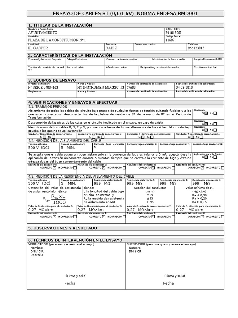 Conductor R identificado correctamente: Si No Tensin aplicada: Conductor S identificado correctamente: Si No Corriente fuga conductor R: Conductor T identificado correctamente: Si No Corriente fuga conductor S: Realizado: Si Realizado: Si Realizado: Si No