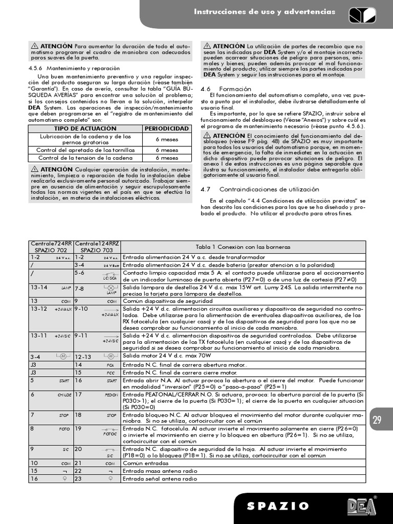 ATENCIN La utilizacin de partes de recambio que no sean las indicadas por DEA System y/o el montaje incorrecto pueden acarrear situaciones de peligro para personas, animales y bienes; pueden adems provocar el mal funcionamiento del producto; utilizar siempre las partes indicadas por DEA System y seguir las instrucciones para el montaje. El funcionamiento del automatismo completo, una vez puesto a punto por el instalador, debe ilustrarse detalladamente al usuario final. Es importante, por lo que se refiere SPAZIO, instruir sobre el funcionamiento del desbloqueo (Vase Anexos) y sobre cul es el programa de mantenimiento necesario (vase punto 4.5.6.). ATENCIN El conocimiento del funcionamiento del desbloqueo (vase F9 pg. 48) de SPAZIO es muy importante para todos los usuarios del automatismo porque, en momentos de emergencia, la falta de inmediatez en la actuacin en dicho dispositivo puede provocar situaciones de peligro. El anexo I de estas instrucciones es una pgina separable que ilustra su funcionamiento, el instalador debe entregarla obligatoriamente al usuario final.