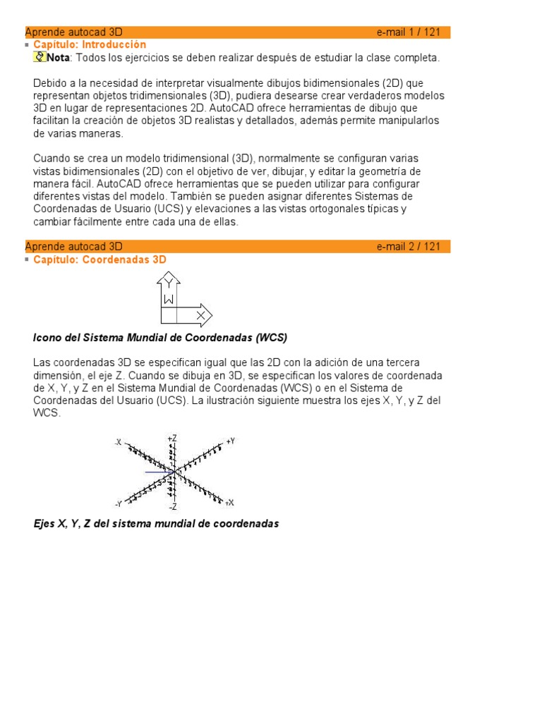 completa. Debido a la necesidad de interpretar visualmente dibujos bidimensionales (2D) que representan objetos tridimensionales (3D), pudiera desearse crear verdaderos modelos 3D en lugar de representaciones 2D. AutoCAD ofrece herramientas de dibujo que facilitan la creacin de objetos 3D realistas y detallados, adems permite manipularlos de varias maneras. Cuando se crea un modelo tridimensional (3D), normalmente se configuran varias vistas bidimensionales (2D) con el objetivo de ver, dibujar, y editar la geometra de manera fcil. AutoCAD ofrece herramientas que se pueden utilizar para configurar diferentes vistas del modelo. Tambin se pueden asignar diferentes Sistemas de Coordenadas de Usuario (UCS) y elevaciones a las vistas ortogonales tpicas y cambiar fcilmente entre cada una de ellas. Aprende autocad 3D Captulo: Coordenadas 3D e-mail 2 / 121