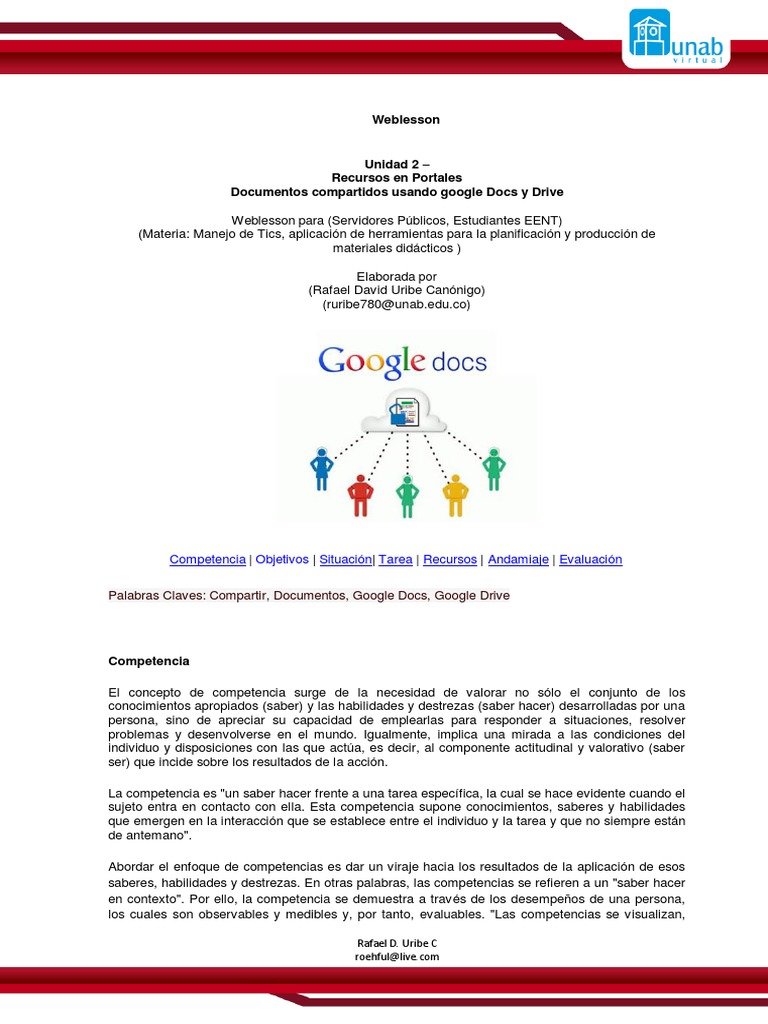 Weblesson Unidad 2 Recursos en Portales Documentos compartidos usando google Docs y Drive Weblesson para (Servidores Pblicos, Estudiantes