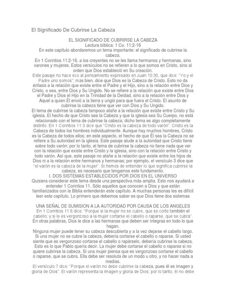 EL SIGNIFICADO DE CUBRIRSE LA CABEZA Lectura bblica: 1 Co. 11:2-16 En este captulo abordaremos un tema importante: el significado de cubrirse la cabeza. En 1 Corintios 11:2-16, a los creyentes no se les llama hermanos y hermanas, sino varones y mujeres. Estos versculos no se refieren a lo que somos en Cristo, sino al orden que Dios estableci en Su creacin. Este pasaje no hace eco al pensamiento expresado en Juan 10:30, que dice: Yo y el Padre uno somos; ms bien, dice que Dios es la Cabeza de Cristo. Esto no da nfasis a la relacin que existe entre el Padre y el Hijo, sino a la relacin entre Dios y Cristo, o sea, entre Dios y Su Ungido. No se refiere a la relacin que existe entre Dios el Padre y Dios el Hijo en la Trinidad de la Deidad, sino a la relacin entre Dios y Aquel a quien l envi a la tierra y ungi para que fuera el Cristo. El asunto de cubrirse la cabeza tiene que ver con Dios y Su Ungido. El tema de cubrirse la cabeza tampoco atae a la relacin que existe entre Cristo y Su iglesia. El hecho de que Cristo sea la Cabeza y que la iglesia sea Su Cuerpo, no est relacionado con el tema de cubrirse la cabeza; dicho tema es algo completamente distinto. En 1 Corintios 11:3 dice que Cristo es la cabeza de todo varn. Cristo es la Cabeza de todos los hombres individualmente. Aunque hay muchos hombres, Cristo es la Cabeza de todos ellos; en este aspecto, el hecho de que l sea la Cabeza no se refiere a Su autoridad en la iglesia. Este pasaje alude a la autoridad que Cristo tiene sobre todo varn; por lo tanto, el tema de cubrirse la cabeza no tiene nada que ver con la relacin que existe entre Cristo y la iglesia, sino con la relacin entre Cristo y todo varn. As que, este pasaje no atae a la relacin que existe entre los hijos de Dios ni a la relacin entre hermanos y hermanas; por ejemplo, el versculo 3 dice que el varn es la cabeza de la mujer. Si hemos de entender lo que significa cubrirse la cabeza, es necesario que tengamos este fundamento. I. DOS SISTEMAS ESTABLECIDOS POR DIOS EN EL UNIVERSO Quisiera considerar este tema desde una perspectiva ms amplia. Esto nos ayudar a entender 1 Corintios 11. Slo aquellos que conocen a Dios y que estn familiarizados con la Biblia entendern este captulo. A muchas personas les es difcil leer este captulo. Lo primero que debemos saber es que Dios tiene dos sistemas UNA SEAL DE SUMISION A LA AUTORIDAD POR CAUSA DE LOS ANGELES En 1 Corintios 11:6 dice: Porque si la mujer no se cubre, que se corte tambin el cabello; y si le es vergonzoso a la mujer cortarse el cabello o raparse, que se cubra. En otras palabras, Dios le dice a las hermanas que deben ser ntegras en todo lo que hagan. Ninguna mujer puede tener su cabeza descubierta y a la vez dejarse el cabello largo. Si una mujer no se cubre la cabeza, debera cortarse el cabello o raparse. Si usted siente que es vergonzoso cortarse el cabello o raprselo, debera cubrirse la cabeza. Esto es lo que Pablo quera decir. La mujer debe cortarse el cabello o raparse si no quiere cubrirse la cabeza. Si una mujer piensa que es vergonzoso cortarse el cabello o raparse, que se cubra. Ella debe ser resoluta de un modo u otro, y no hacer nada a medias. El versculo 7 dice: Porque el varn no debe cubrirse la cabeza, pues l es imagen y gloria de Dios. El varn representa la imagen y gloria de Dios; por lo tanto, l no debe