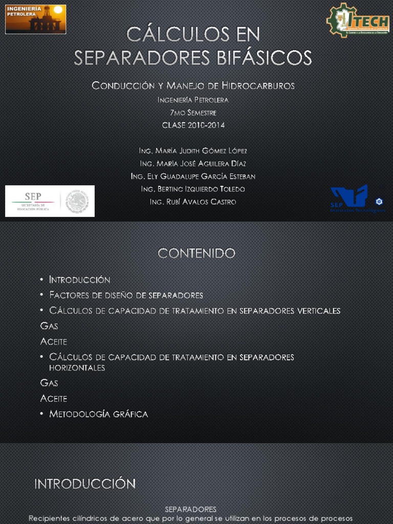 125 y 1800 2. Las dimensiones y condiciones del separador son: