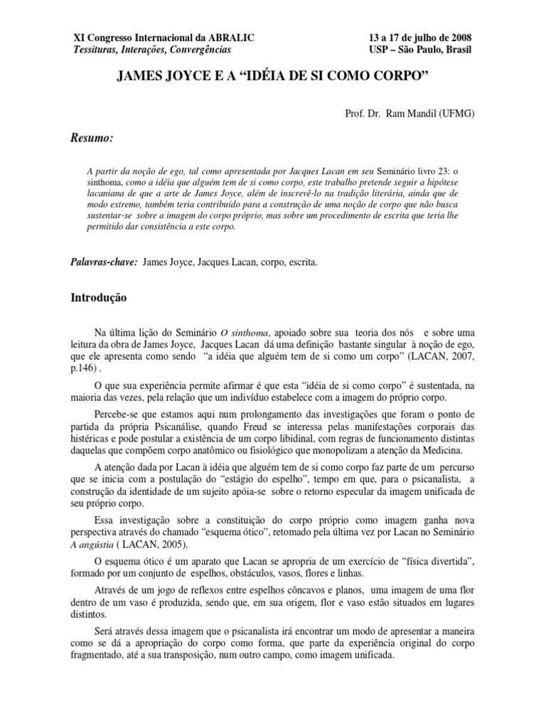 A partir da noo de ego, tal como apresentada por Jacques Lacan em seu Seminrio livro 23: o sinthoma, como a idia que algum tem de si como corpo, este trabalho pretende seguir a hiptese lacaniana de que a arte de James Joyce, alm de inscrev-lo na tradio literria, ainda que de modo extremo, tambm teria contribudo para a construo de uma noo de corpo que no busca sustentar-se sobre a imagem do corpo prprio, mas sobre um procedimento de escrita que teria lhe permitido dar consistncia a este corpo.