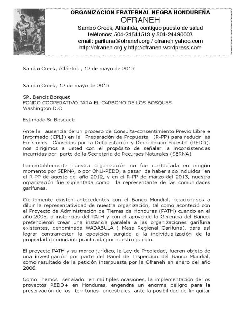 Sambo Creek, 12 de mayo de 2013 SR. Benoit Bosquet FONDO COOPERATIVO PARA EL CARBONO DE LOS BOSQUES Washington D.C Estimado Sr Bosquet: Ante la ausencia de un proceso de Consulta-consentimiento Previo Libre e Informado (CPLI) en la Preparacin de Propuesta (R-PP) para reducir las Emisiones Causadas por la Deforestacin y Degradacin Forestal (REDD), nos dirigimos a usted con el propsito de sealar la inconsistencias incurridas por parte de la Secretaria de Recursos Naturales (SERNA). Lamentablemente nuestra organizacin no fue contactada en ningn momento por SERNA, o por ONU-REDD, a pesar de haber sido incluidos en el R-PP de agosto del ao 2012, y en el R-PP de marzo del 2013, nuestra organizacin fue suplantada como la representante de las comunidades garfunas. Ciertamente existen antecedentes con el Banco Mundial, relacionados a diluir la representatividad de nuestra organizacin, tal como aconteci con el Proyecto de Administracin de Tierras de Honduras (PATH) cuando en el ao 2005, a instancias del PATH y con el apoyo de la Gerencia del Banco, pretendieron crear una instancia paralela a las organizaciones garfuna existentes, denominada WADABULA ( Mesa Regional Garfuna), para as lograr contrarrestar la oposicin surgida a la individualizacin de la propiedad comunitaria practicada por nuestro pueblo. El proyecto PATH y su marco jurdico, la Ley de Propiedad, fueron objeto de una investigacin por parte del Panel de Inspeccin del Banco Mundial, como resultado de la peticin interpuesta por la Ofraneh en enero del ao 2006. Como hemos sealado en mltiples ocasiones, la implementacin de los proyectos REDD+ en Honduras, engendra un enorme peligro para la preservacin de los territorios ancestrales, ante la posibilidad de finiquitar