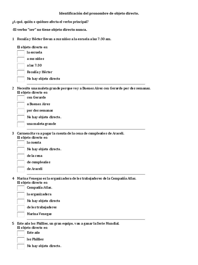 -El verbo ser no tiene objeto directo nunca. 1 Rosala y Hctor llevan a sus nios a la escuela a las 7:30 am. El objeto directo es: la escuela a sus nios a las 7:30 Rosala y Hctor No hay objeto directo 2 Necesito una maleta grande porque voy a Buenos Aires con Gerardo por dos semanas. El objeto directo es: con Gerardo a Buenos Aires por dos semanas No hay objeto directo. una maleta grande 3 Carmencita va a pagar la cuenta de la cena de cumpleaos de Araceli. El objeto directo es: la cuenta No hay objeto directo. de la cena de cumpleaos de Araceli 4 Marina Venegas es la organizadora de los trabajadores de la Compaa Atlas. El objeto directo es: Compaa Atlas. la organizadora No hay objeto directo de los trabajadores Marina Venegas 5 Este ao los Phillies, un gran equipo, van a ganar la Serie Mundial. El objeto directo es: Este ao los Phillies No hay objeto directo.